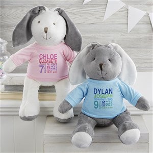 Celebrate baby's arrival with the All About Baby Personalized Plush Bunny Stuffed Animal. The adorable bunny features a neutral color scheme and embroidered details.