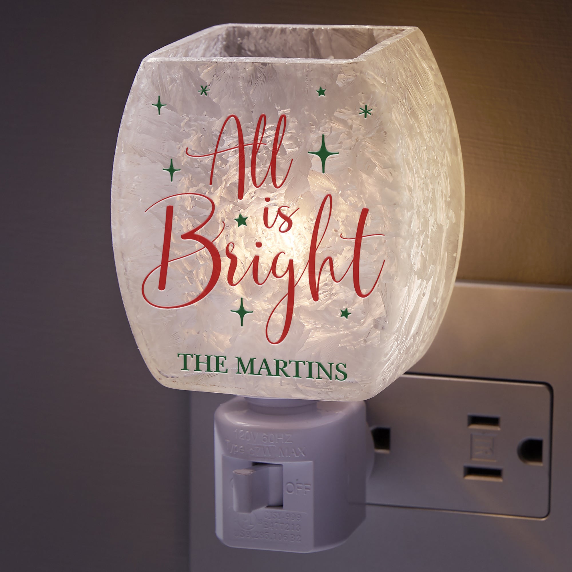 Decorate your home and gently light any room or hallway this holiday season with our All Is Bright Personalized Frosted Night Light.