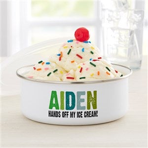 The All Mine! Personalized Enamel Bowl with Lid is a great snack accessory for any kitchen.