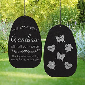Turn a quiet breeze into a soothing, musical symphony with our All Our Hearts Personalized Premium Wind Chimes for Grandma. Featuring all the names of her grandchildren, this makes a great gift for Mother's Day or Grandparents Day.