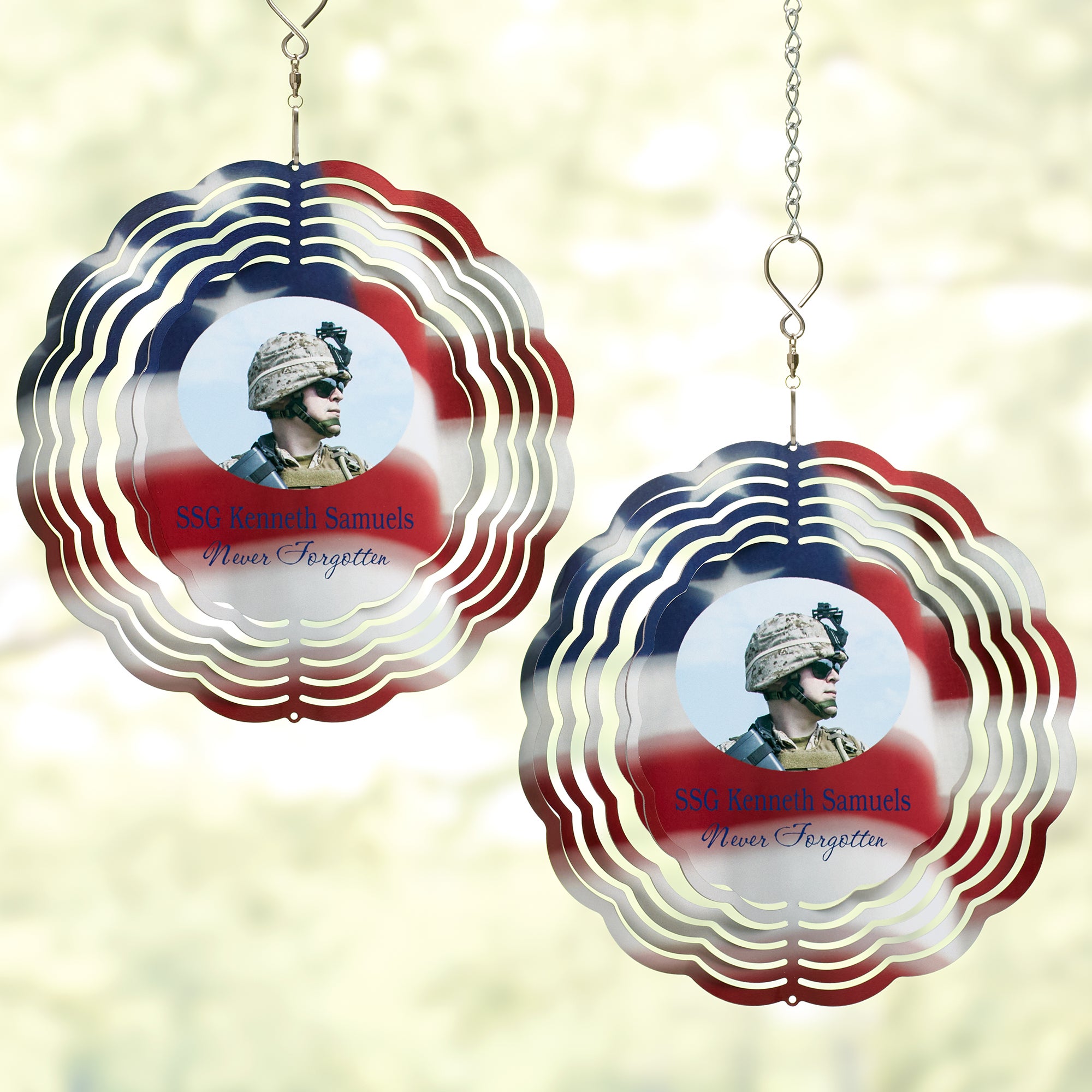 The American Flag and Photo Personalized Wind Spinner opens up into a beautiful piece of art that moves and spins in the wind. Hang outside in the garden or off of a porch and enjoy your photos as they catch the wind.