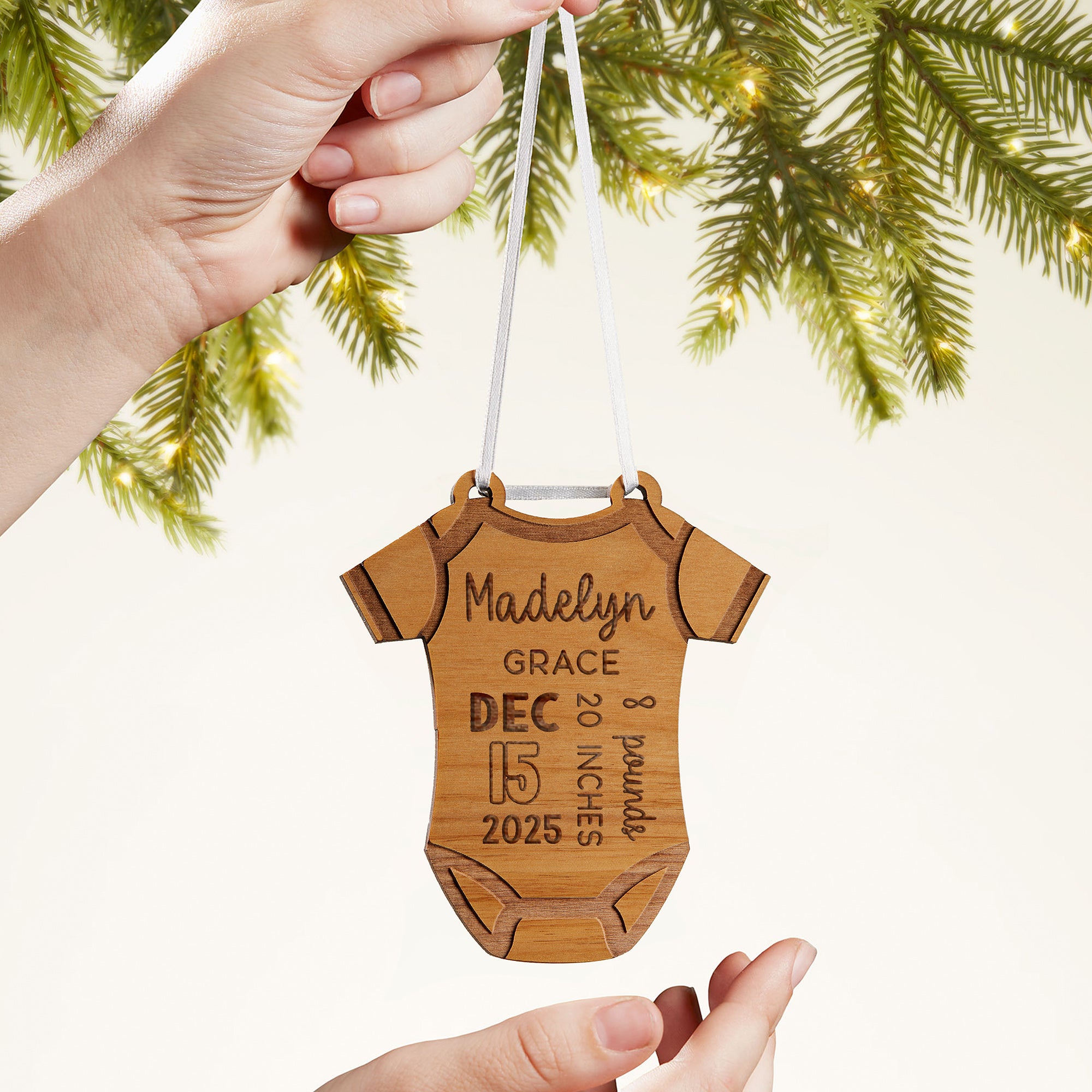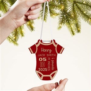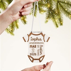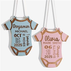 Celebrate the joy of a new arrival with our Baby Bodysuit Personalized Wood Ornament. This keepsake features all the essential birth details.