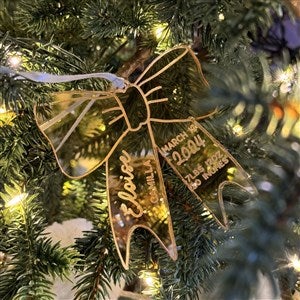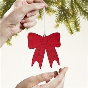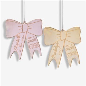 Celebrate the new bundle of joy this Holiday season with the Baby Bow Personalized Acrylic Ornament! The bow is cutout of a mirrored acrylic creating a beautiful reflection to hang on any holiday tree.
