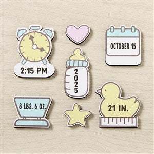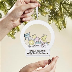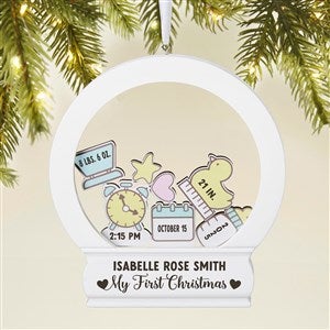 A perfect way to celebrate the new bundle of joy with the Baby Personalized Snow Globe Shaker Ornament. This ornament has a clear front and a hollow space inside that is filled with small baby icons. This ornament creates a fun effect when you shake it.