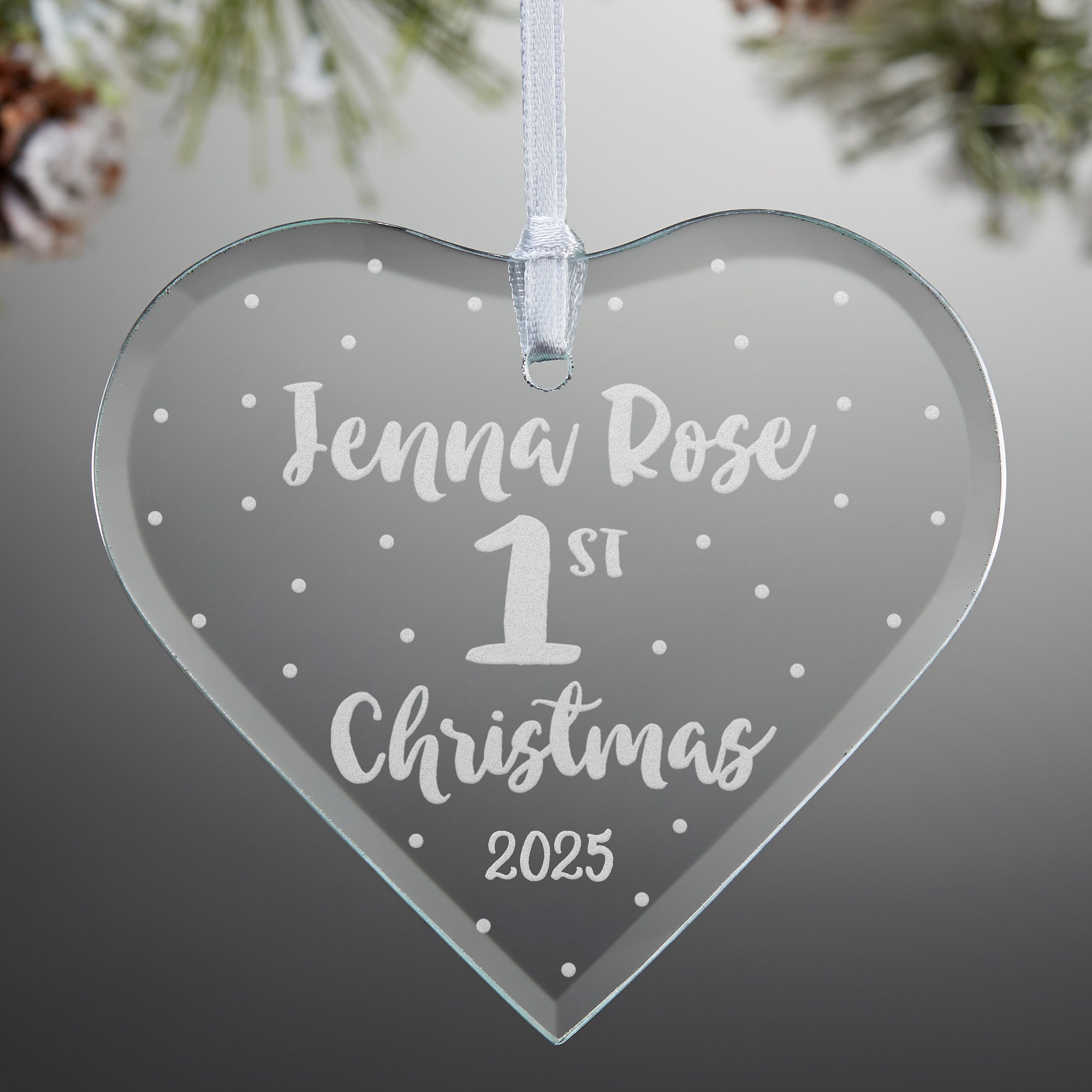 Commemorate all the exciting festivities of the holidays with our Baby's First Christmas Engraved Glass Heart Ornament. Make this ornament a special keepsake for years to come.