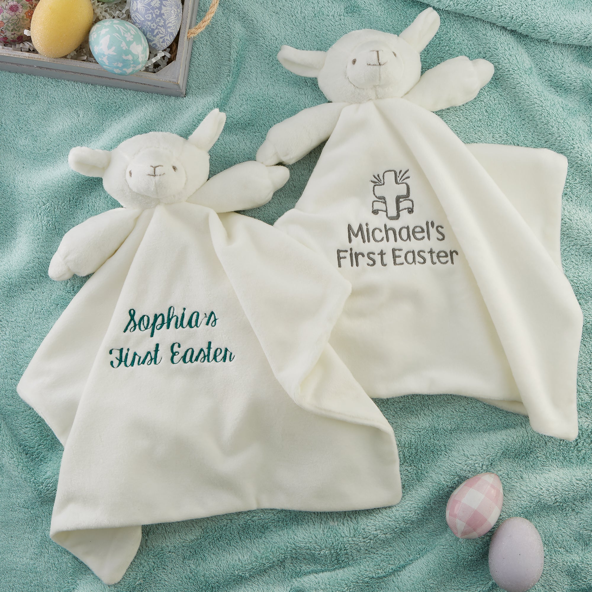 Incredibly soft and cuddly to the touch, our Baby's First Easter Personalized Lamb Blankie is Mom's popular choice for a security blanket and perfectly sized for baby to cuddle.