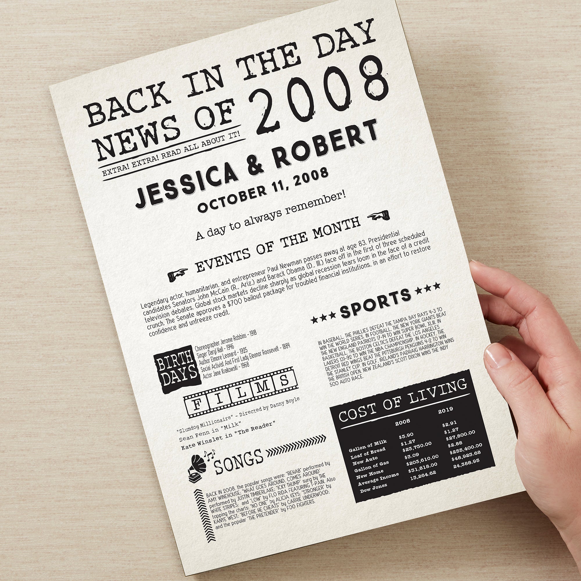 Commemorate any special day with the Back In The Day Personalized Oversized Anniversary Greeting Card. The personalized chronicle card is made to look like a newspaper front page and includes specific details and events of this special day to give you an accurate record... enjoy your walk down memory lane.