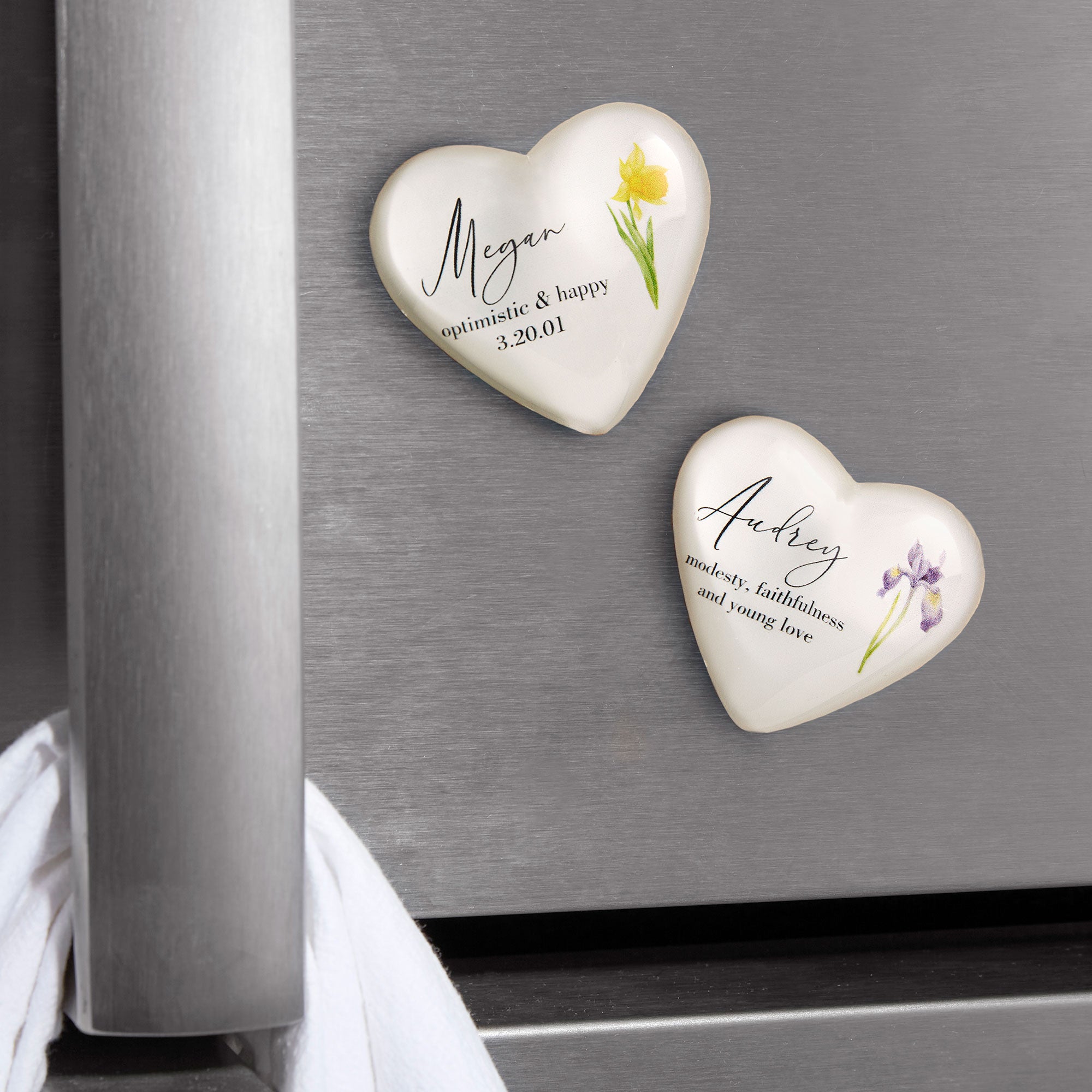 Show her your love with the Birth Month Flower Personalized Acrylic Heart Magnet.