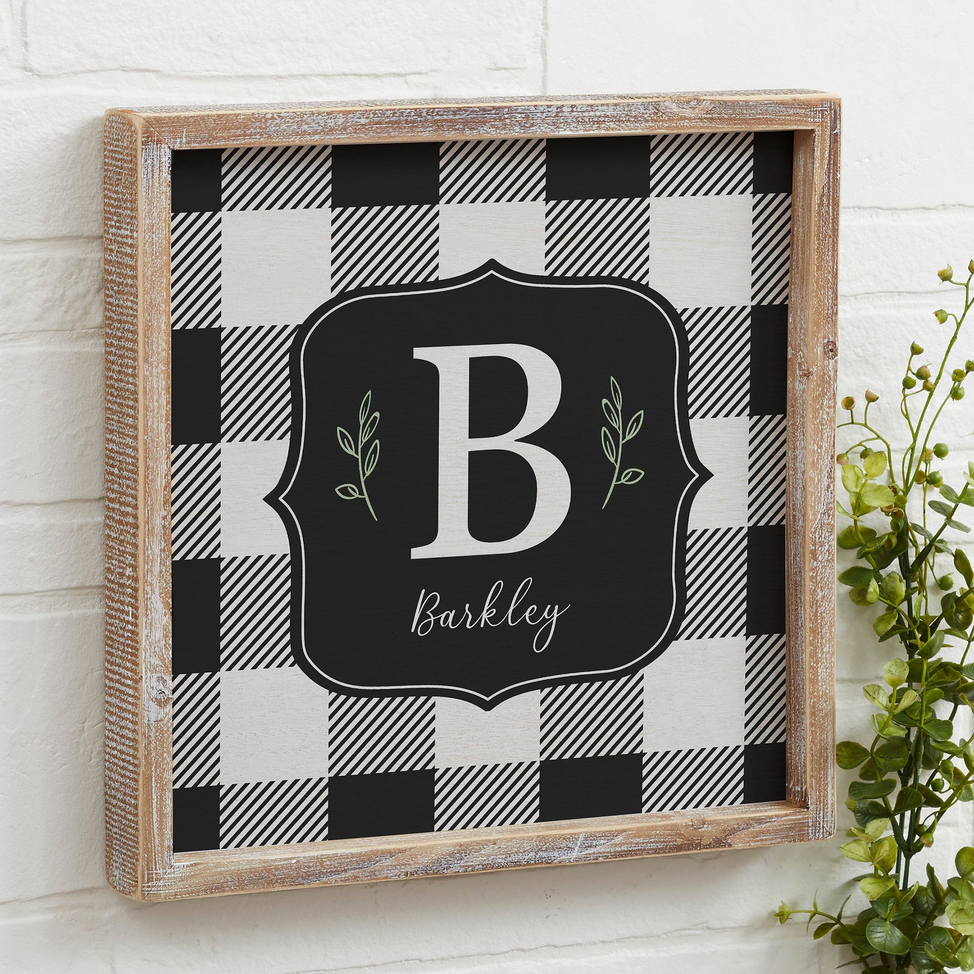 • Printed with any initial and optional line of text accented with a black & white buffalo check design
