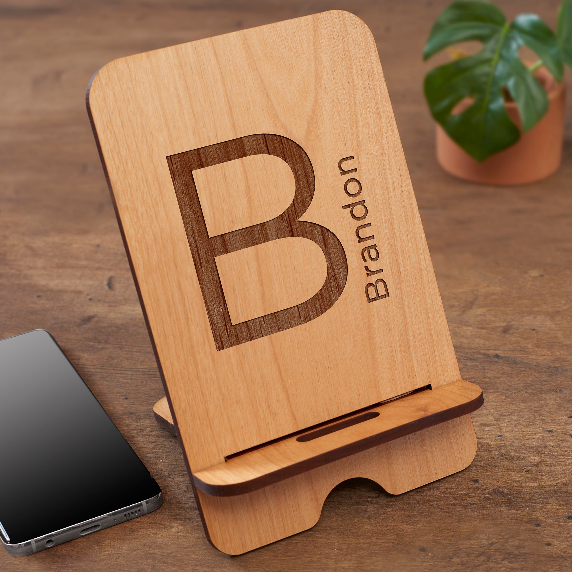 Keep your phone charged and ready wherever you need it with our Block Initial Personalized Wooden Phone Stand. This phone stand will hold your phone and features a place to fit your charger, making the perfect office gift or desk accessory.