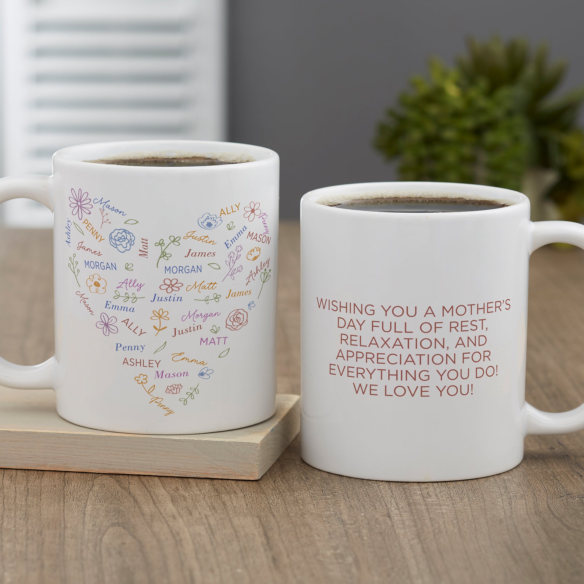 Her heart will be full when she drinks from our Blooming Heart Personalized Coffee Mug designed exclusively for that special lady. A perfect gift for Moms and Grandmas for Mother's Day or any special occasion.