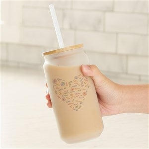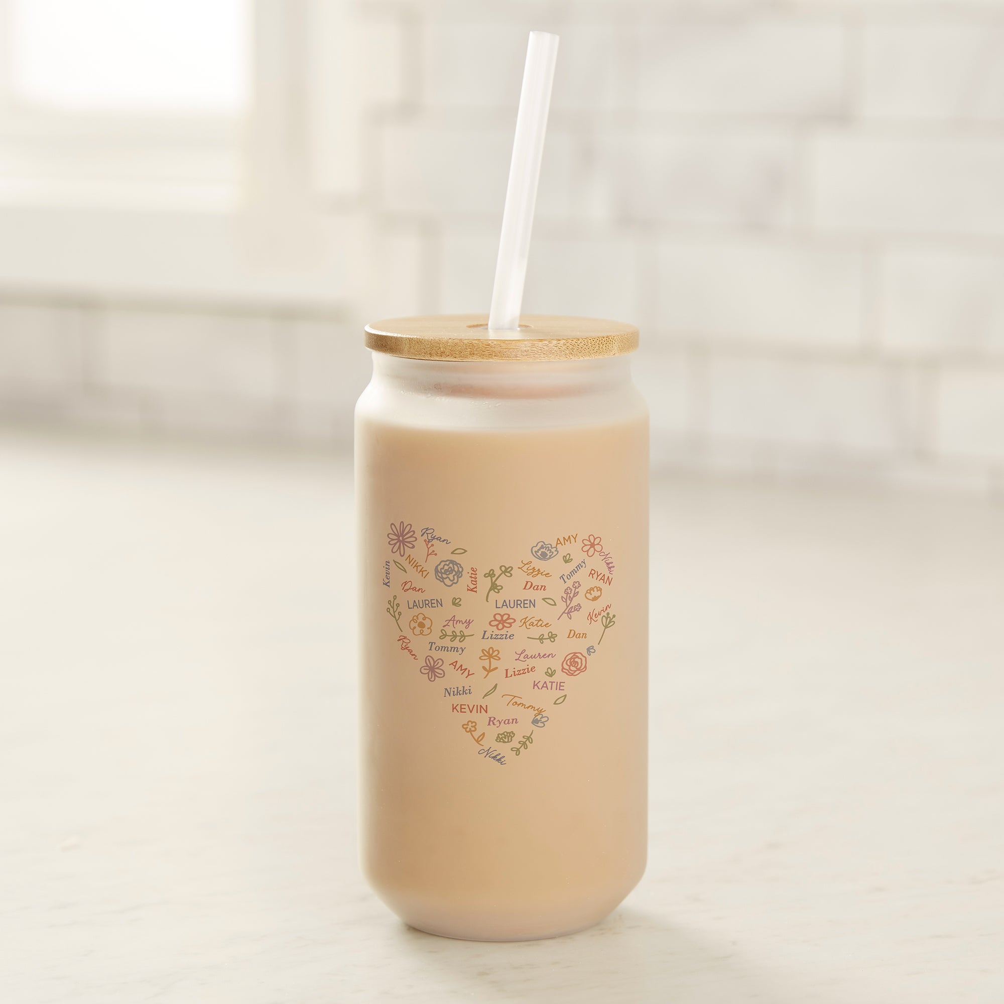 Sip in style with our Blooming Heart Personalized Frosted Iced Coffee Tumbler. A bamboo lid and straw add sustainable style and functionality, making this a perfect choice for travel drinkware and reducing spills in any environment! The bamboo lid fits perfectly on the glass and has a hole specifically built for the straw.