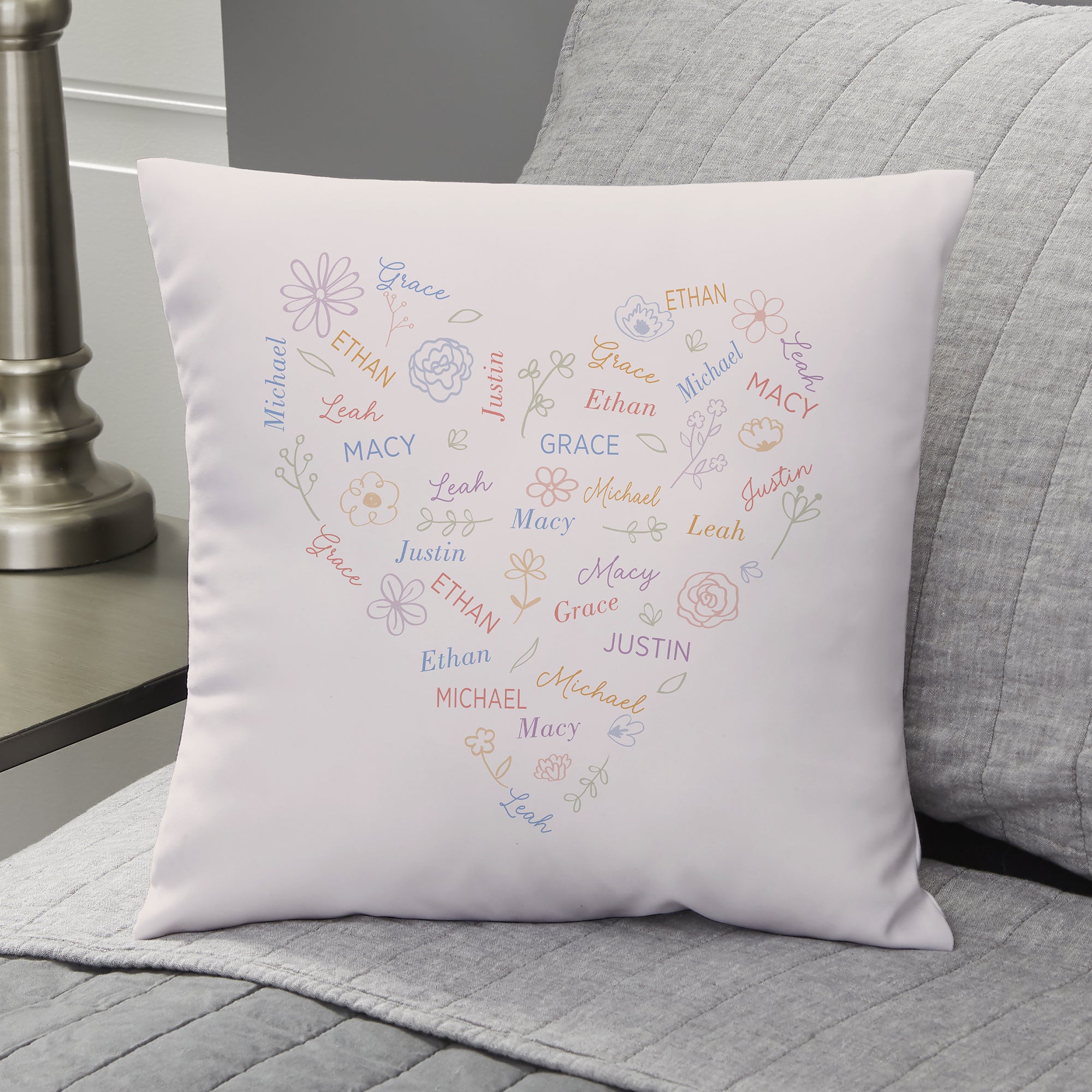 Give a beautiful and thoughtful ensemble for her living room or bedroom with our Blooming Heart Personalized Throw Pillow. The heart design includes repeating names and flower icons in multiple color options to match any home decor.
