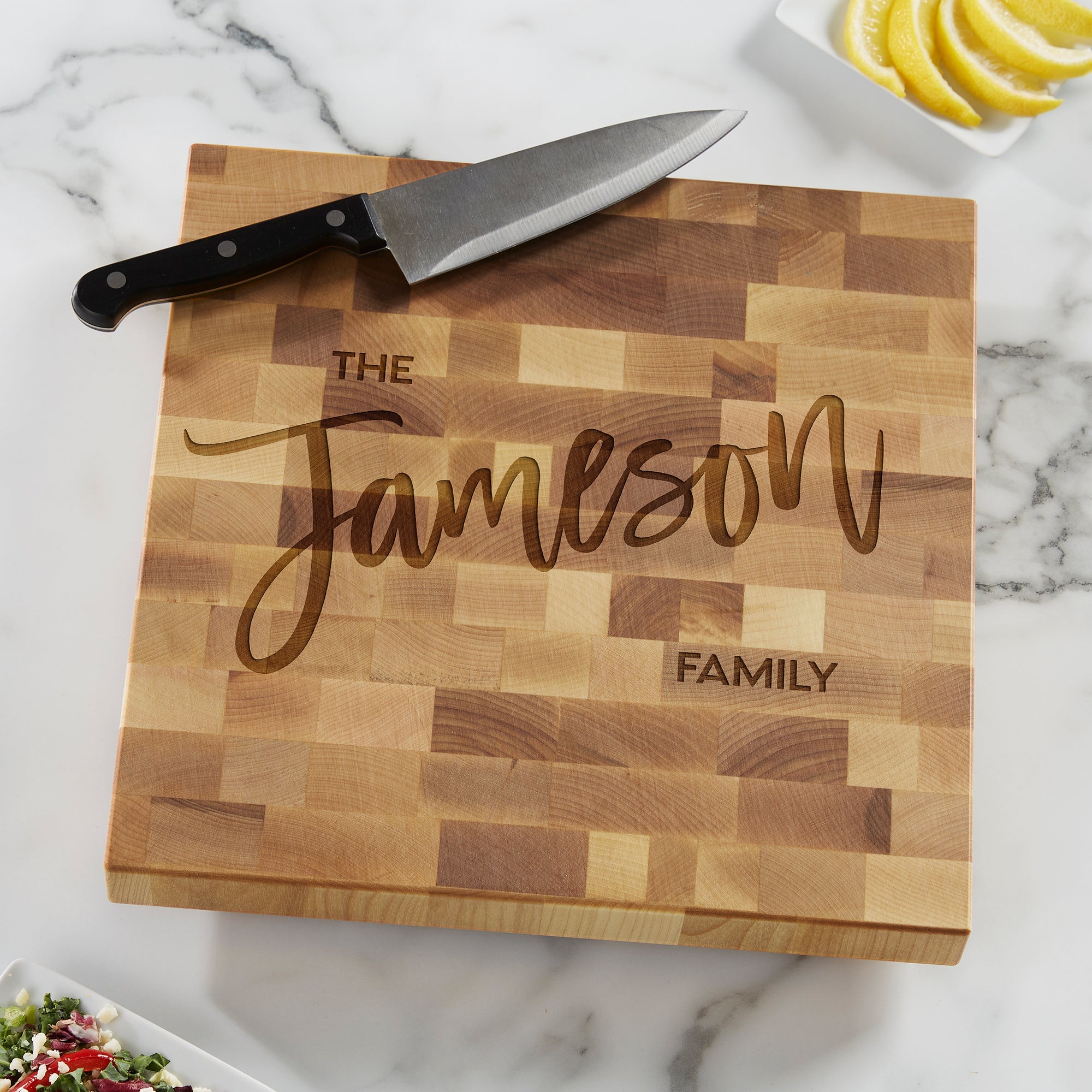 Product Information 35937-12 - Bold Family Name Personalized 12x12 Butcher Block Cutting Board