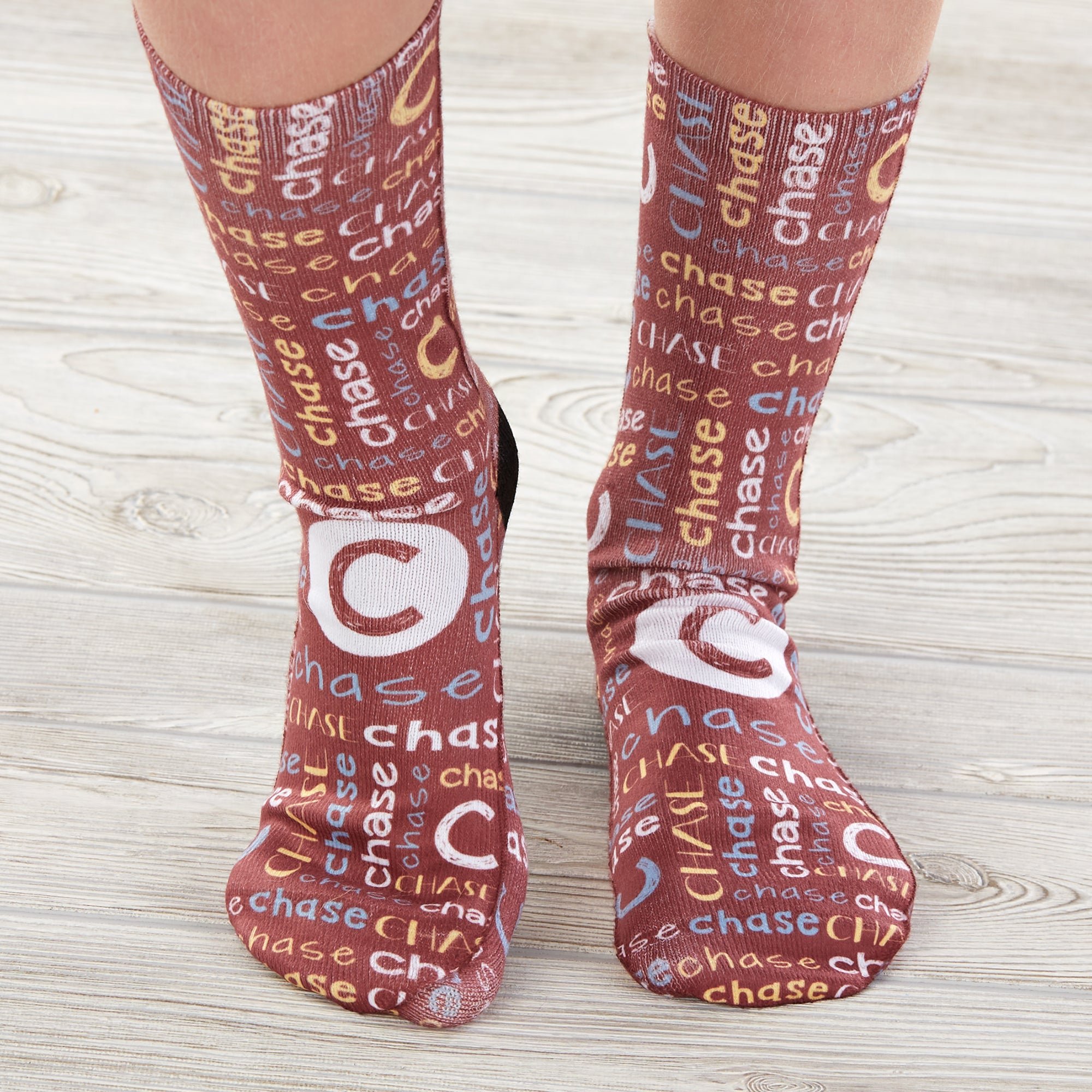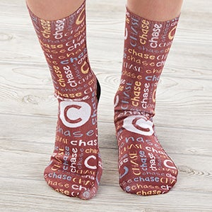 Your child will love walking around the house in their very own Youthful Name for Him Personalized Kids Socks. The fun colorful repeating name design creates the perfect accessory piece to any outfit.