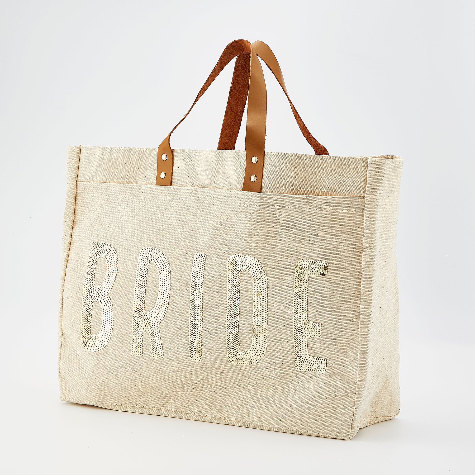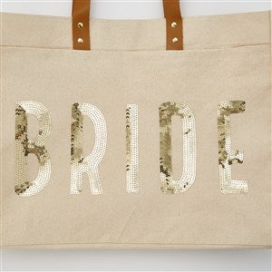 • Canvas tote bag with "BRIDE" written in gold sequins on the side of the bag, cannot be further customized or altered