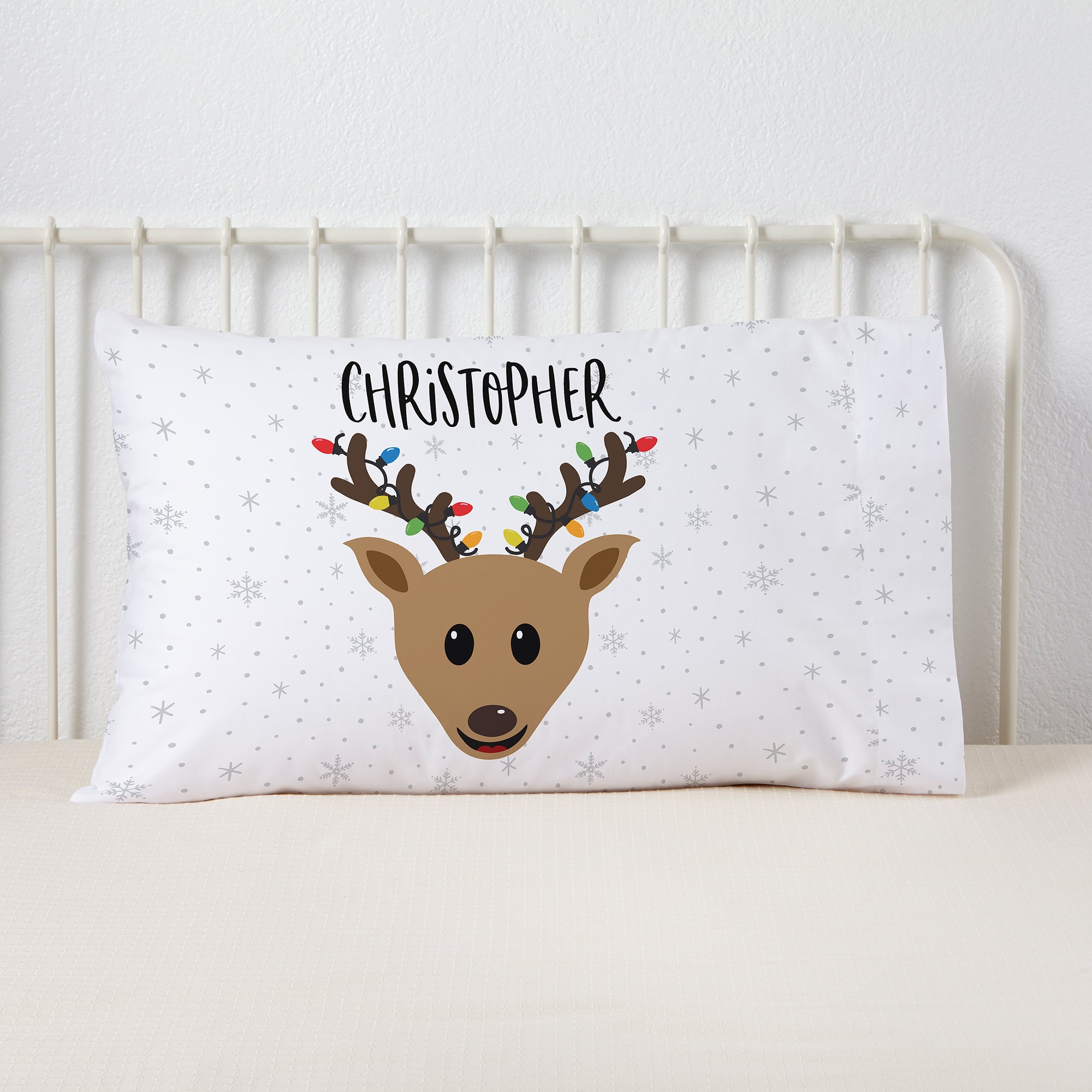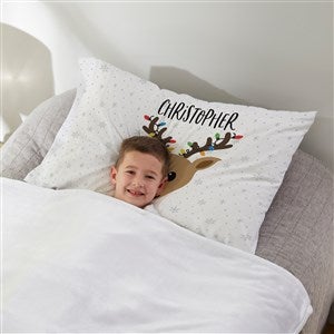 Add some holiday flair to your bed this season with the Build Your Own Boy Reindeer Personalized Pillowcase.