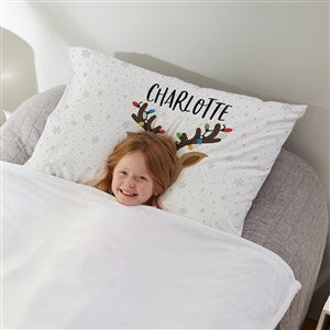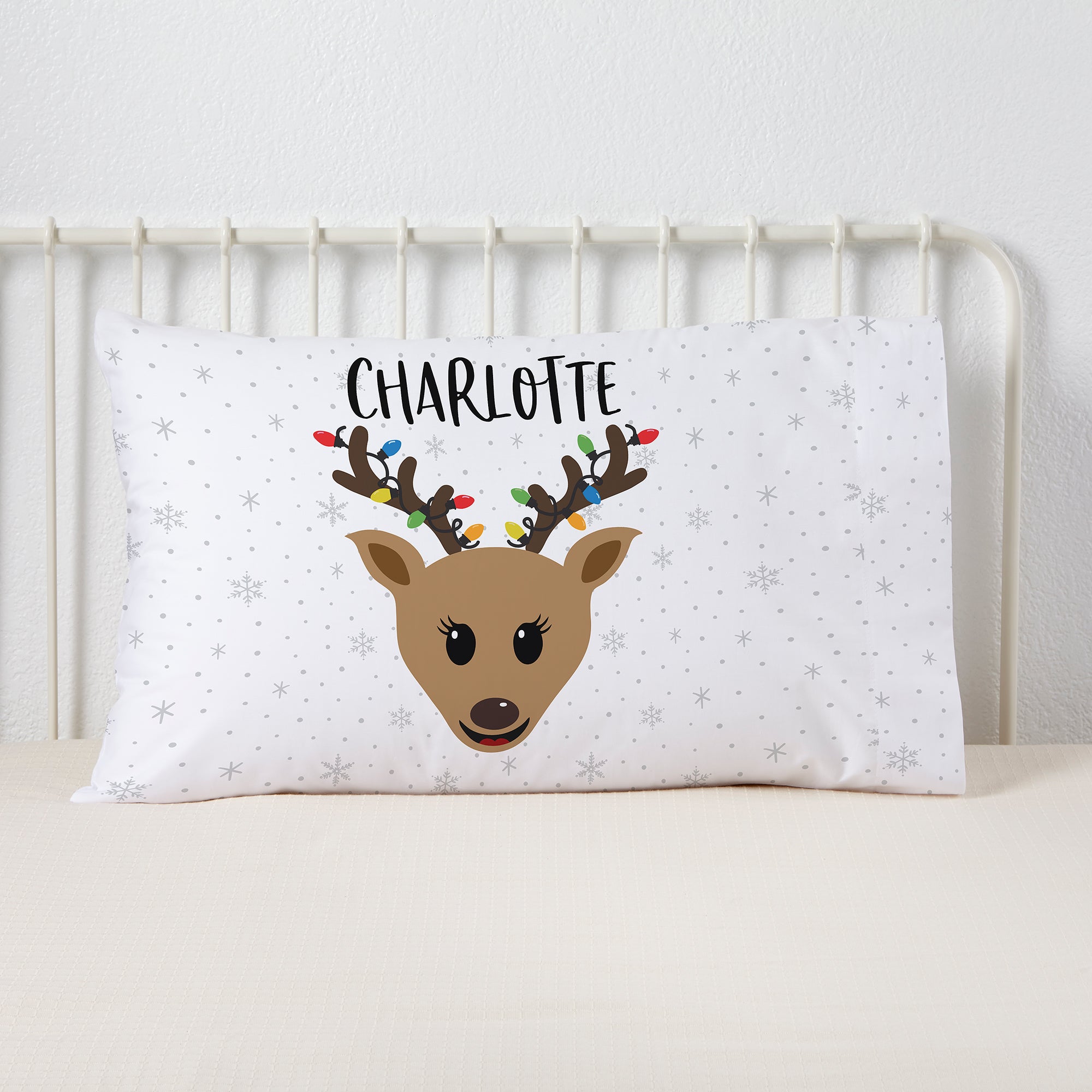 Add some holiday flair to your bed this season with the Build Your Own Girl Reindeer Personalized Pillowcase.