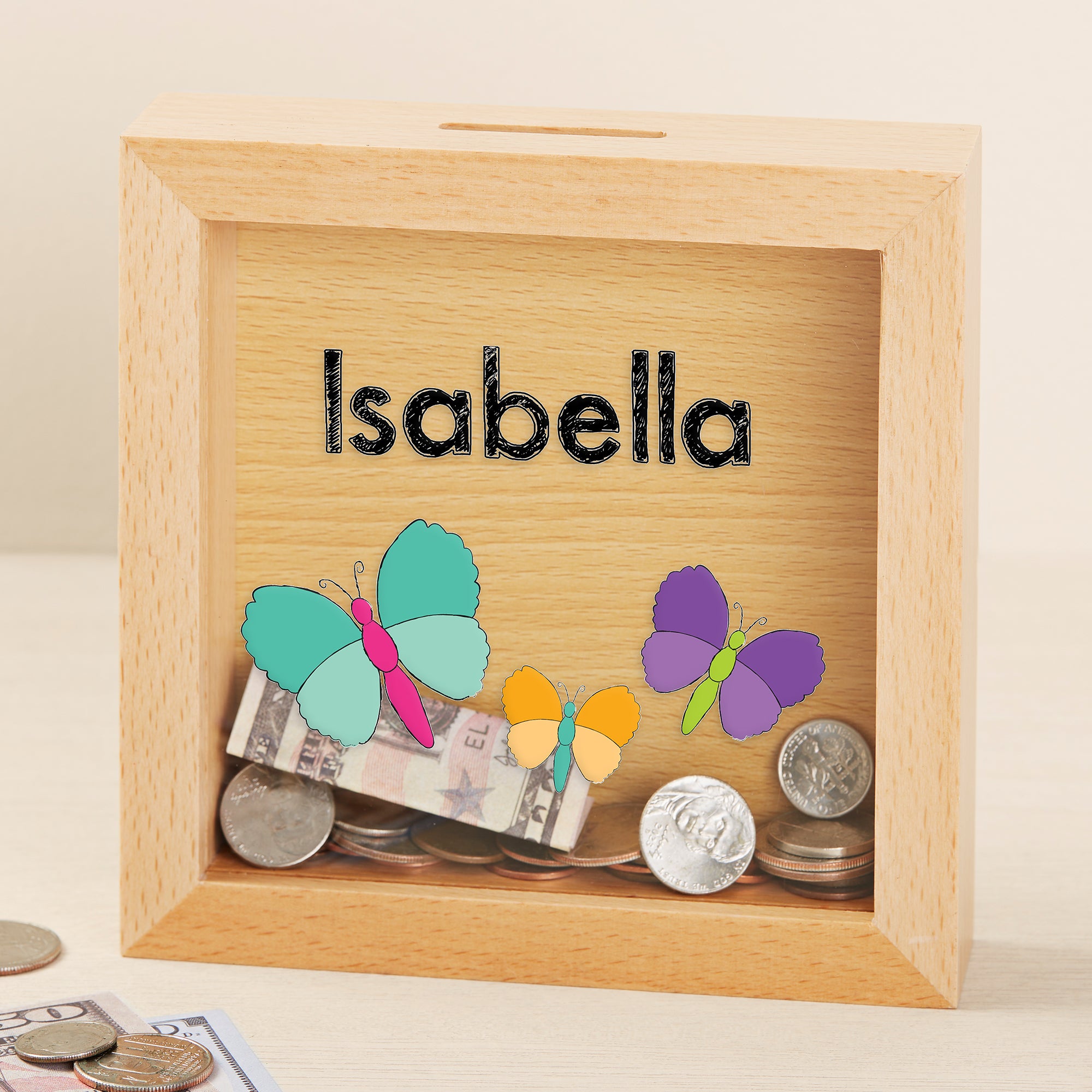 - Slot on top of bank measures 1.5" L to insert money