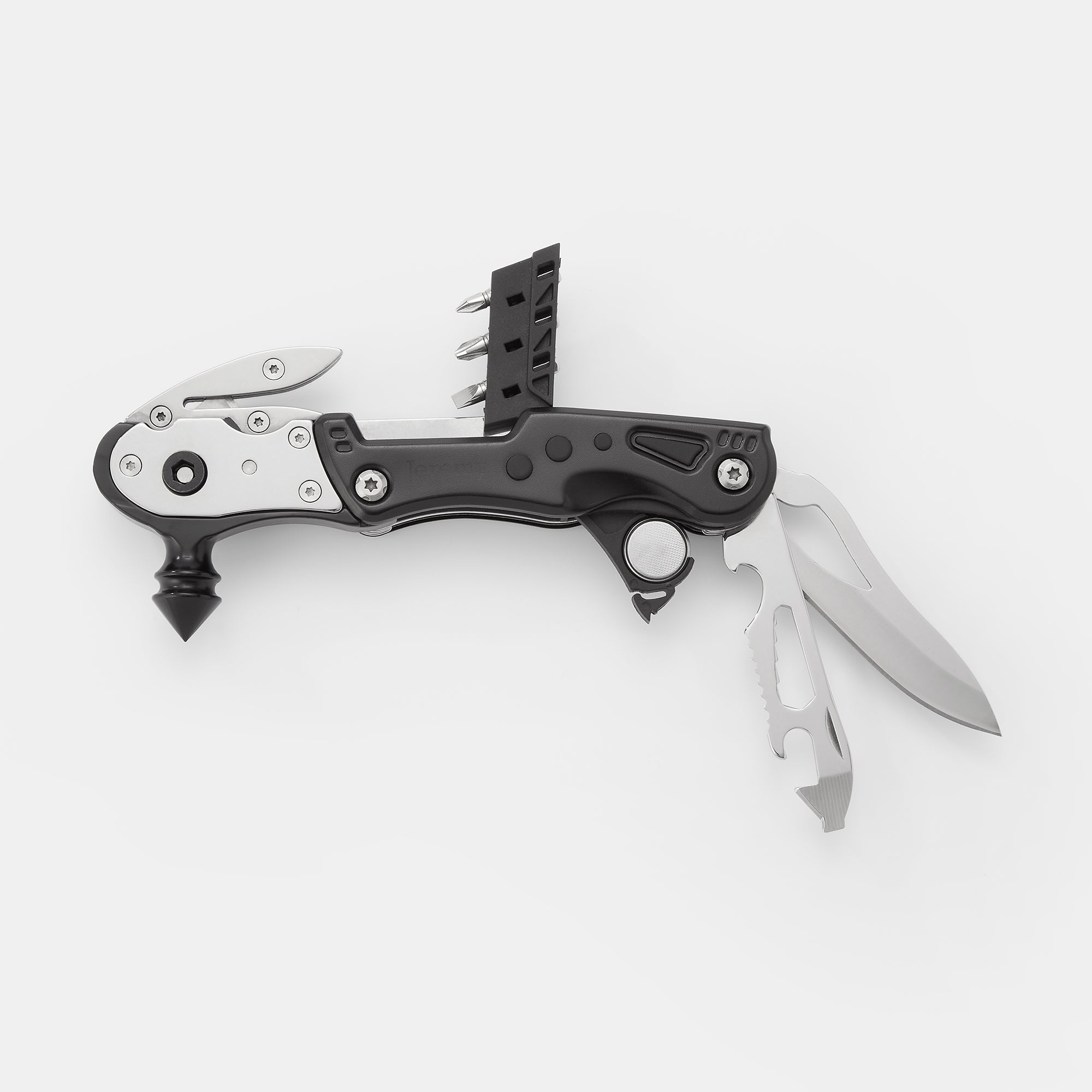 - Tools include glass breaker, seat belt cutter, ratchet driver with 3 screwdriver bits, knife blade, saw blade, bottle opener, multiple wrench components and an LED light