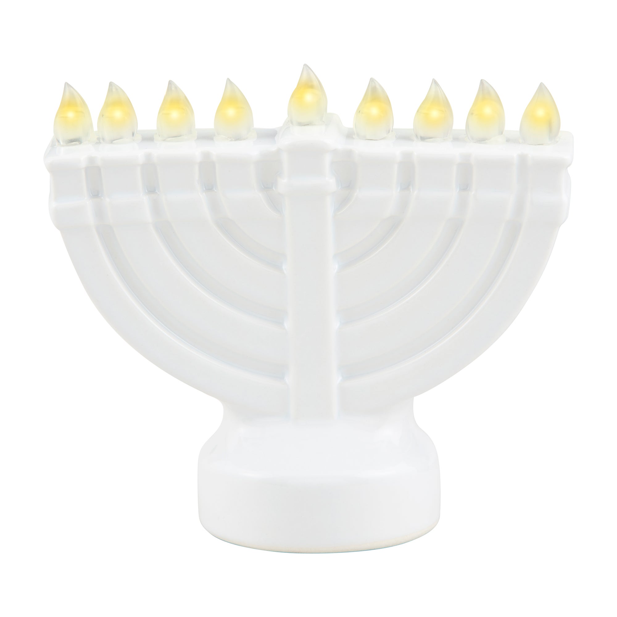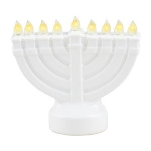 - White menorah with 9 lights that lights up with warm LED lights; batteries included