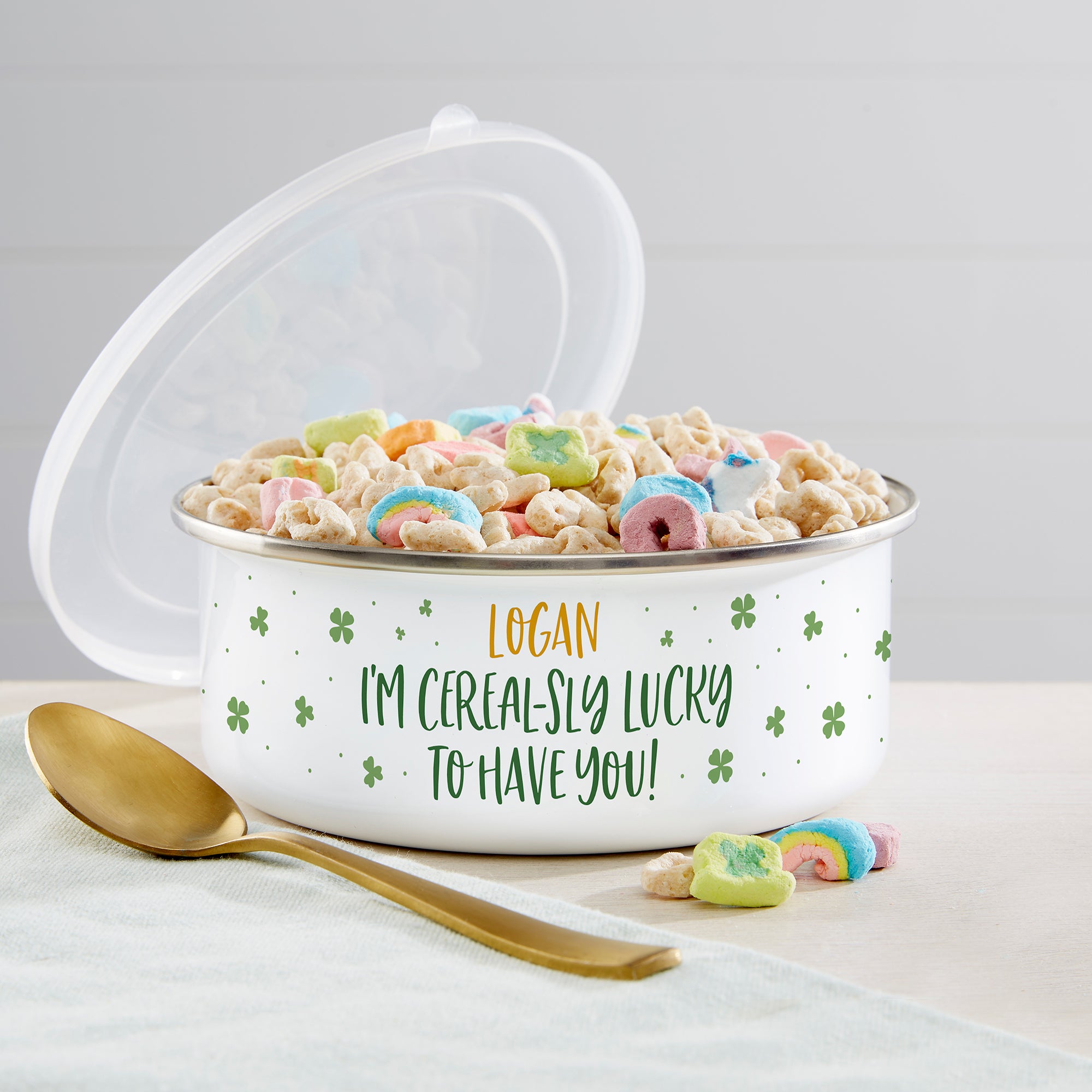 The Cerealsly Lucky To Have You Personalized Enamel Bowl with Lid is a great snack accessory for any this St. Patrick's Day!