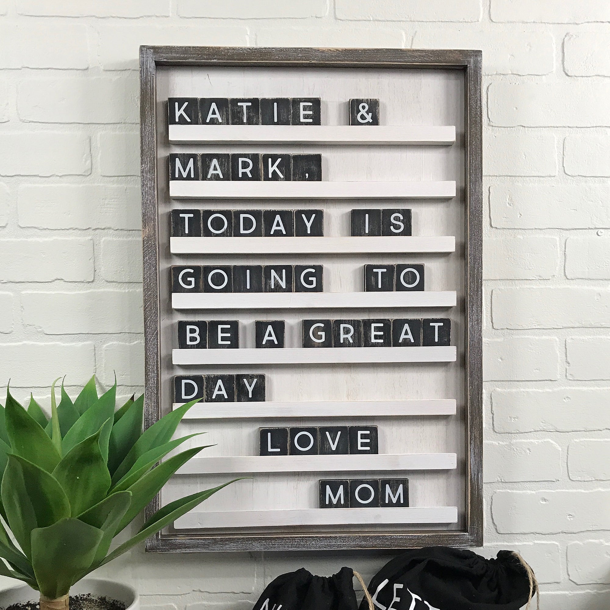 - Framed Letter Board has a rustic whitewashed finish