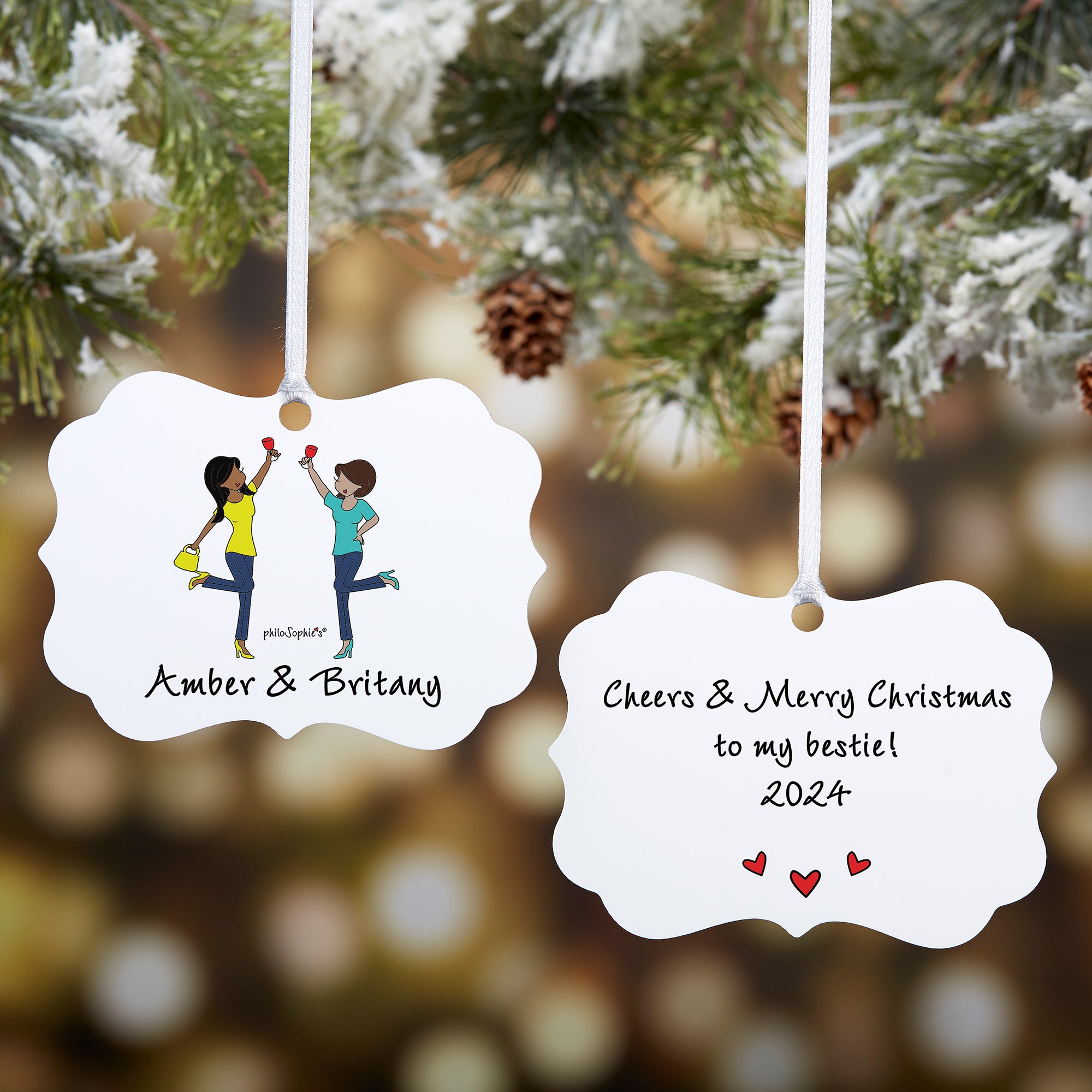 The Cheers to Friendship philoSophie's® Personalized Metal Ornament makes a unique gift for your besties! Add a flare of personalized style to any Christmas tree or ornament stand this holiday season!