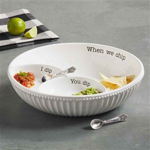 "When we chip, you dip in this Chip and Double Dip Set. The three piece set comes with a fluted and beaded ceramic chip bowl that reads "When we chip". The bowl comes with two integral dip wells that read "I dip" and "You dip". The set comes with two stamped silver-plate spoons."