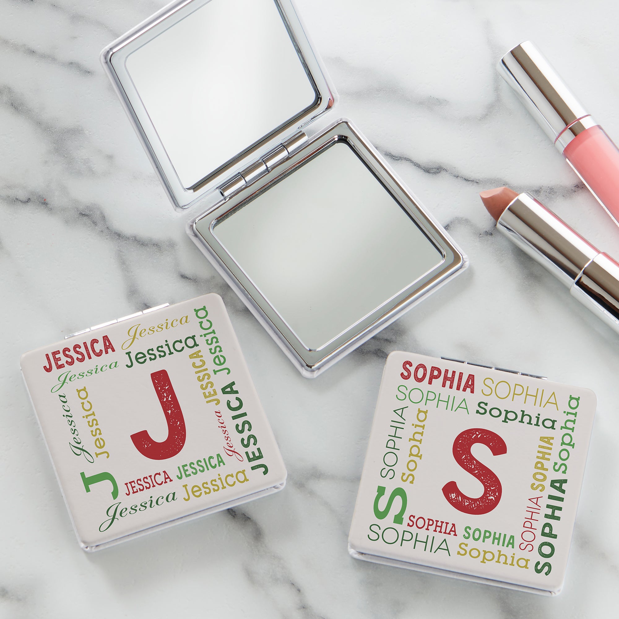 Our Christmas Repeating Name Personalized Compact Mirror will be a true reflection of her beauty this holiday season. This essential accessory was designed for women on the go. Perfectly sized to slip into her purse or pocket, she will use it often to touch up her make-up, hair and more. Makes a thoughtful gift or stocking stuffer for Christmas.