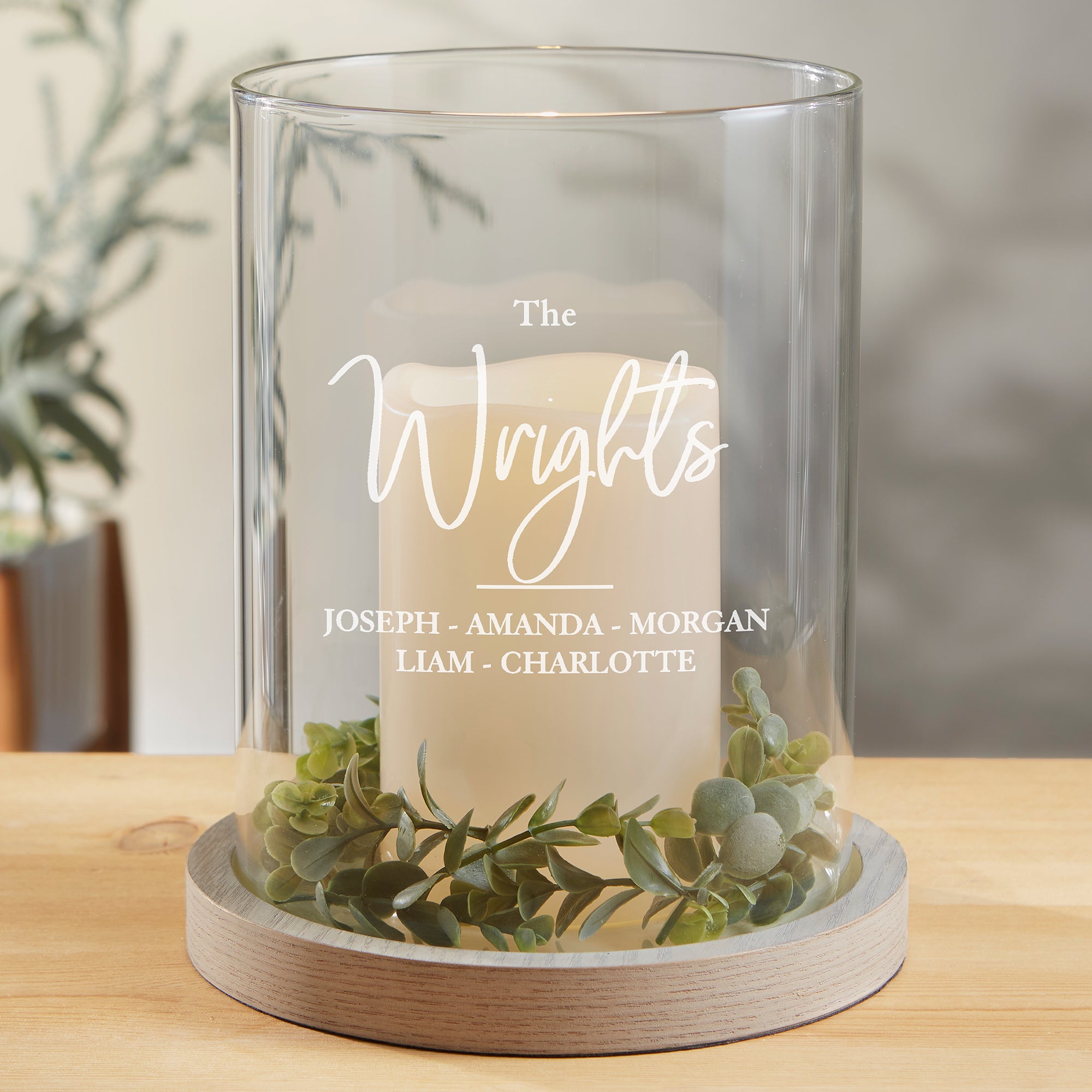 Add a modern and sleek piece of home decor with the Classic Elegance Family Personalized Hurricane with Whitewashed Wood Base.
