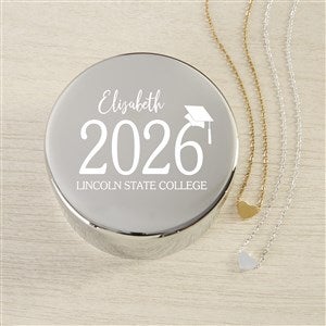The Classic Graduation Personalized Round Jewelry Box Gift Set with Heart Necklace is a great graduation gift and a stylish piece to safely store jewelry or special keepsakes and mementos.