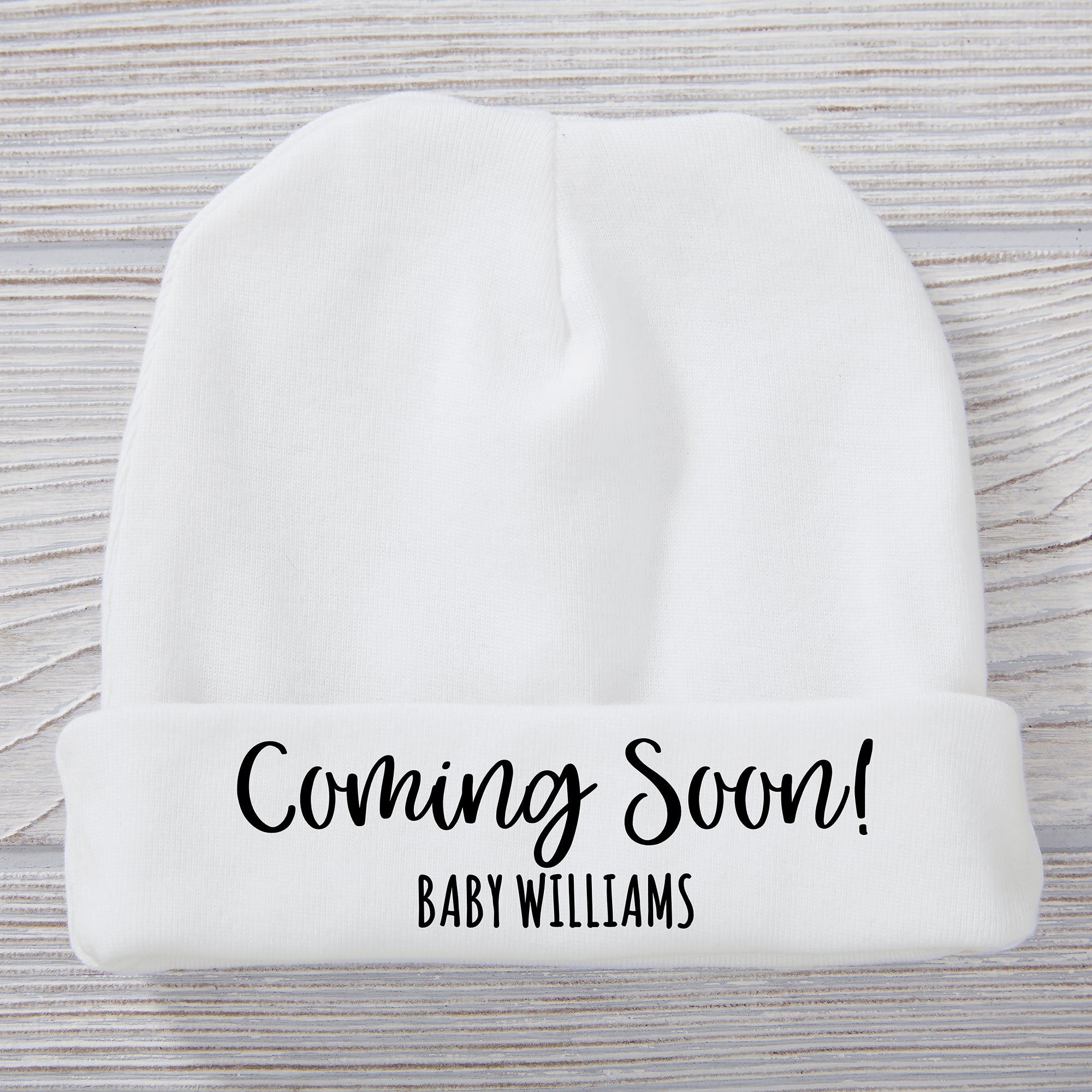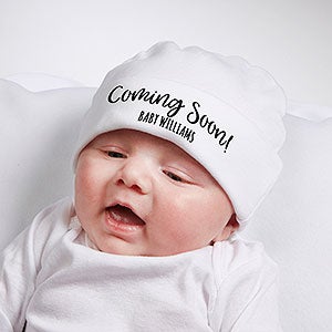 Share the exciting news of the newest arrival with our Coming Soon Pregnancy Announcement Personalized Baby Hat.
