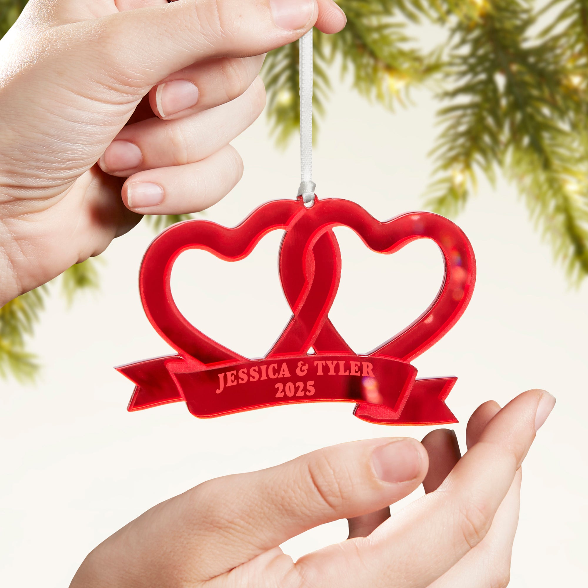 Celebrate the happy couple this Holiday season with the Connected Hearts Personalized Acrylic Ornament! The double heart is cutout of a mirrored acrylic creating a beautiful reflection to hang on any holiday tree.