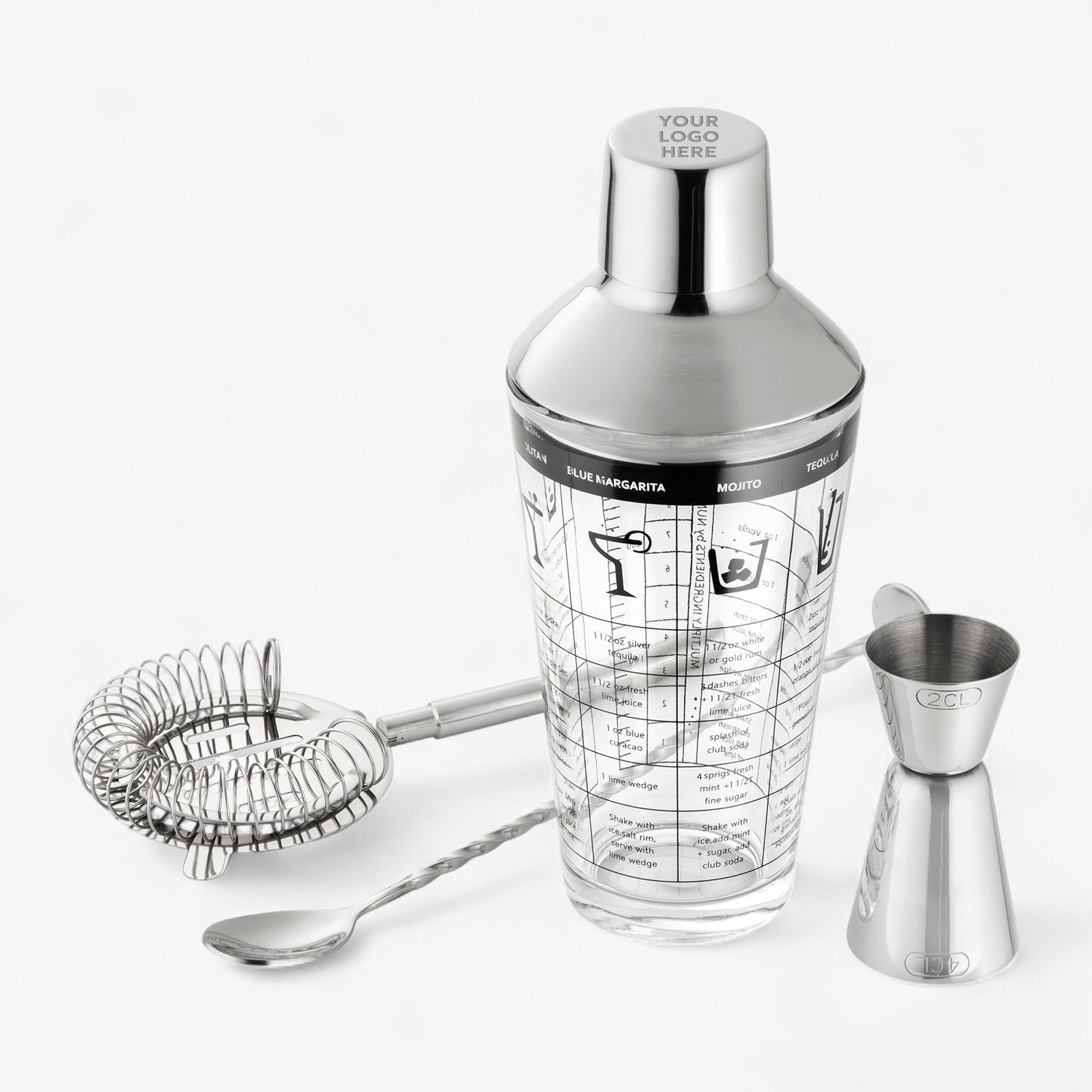- Cocktail set with 4 pieces including glass recipe shaker, strainer, jigger, and mixing spoon