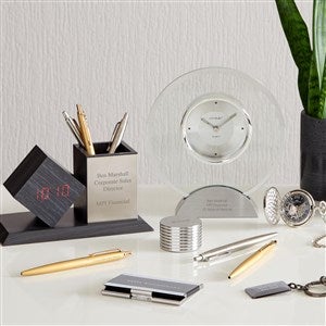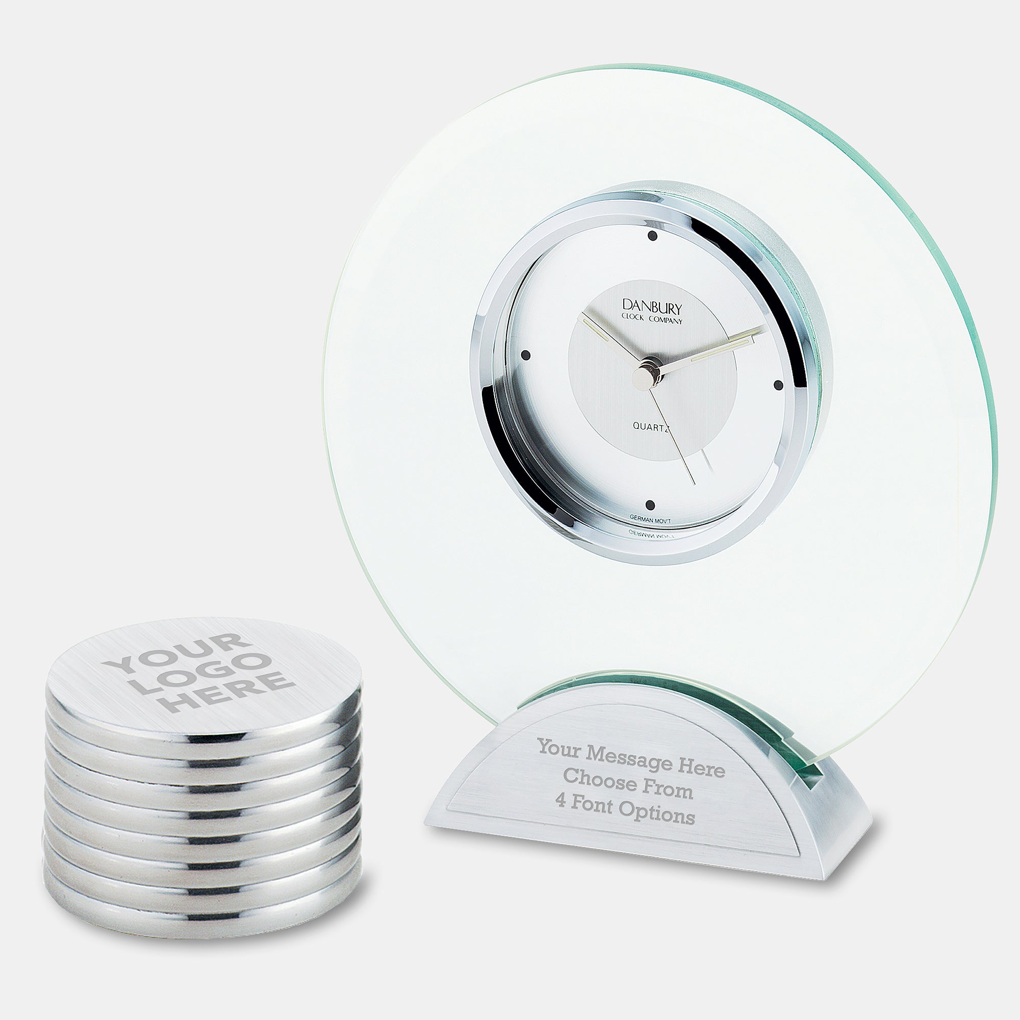 Our Round Clock and Paperweight Set provides the perfect desk organization duo- they'll have the time in view and their papers locked down! The clock's clean design fits with any décor and is sized for use on any desk or shelf. Our customers love giving this set to celebrate a promotion, achievement, or new employee. Custom engraved with any name, logo, and/or text.