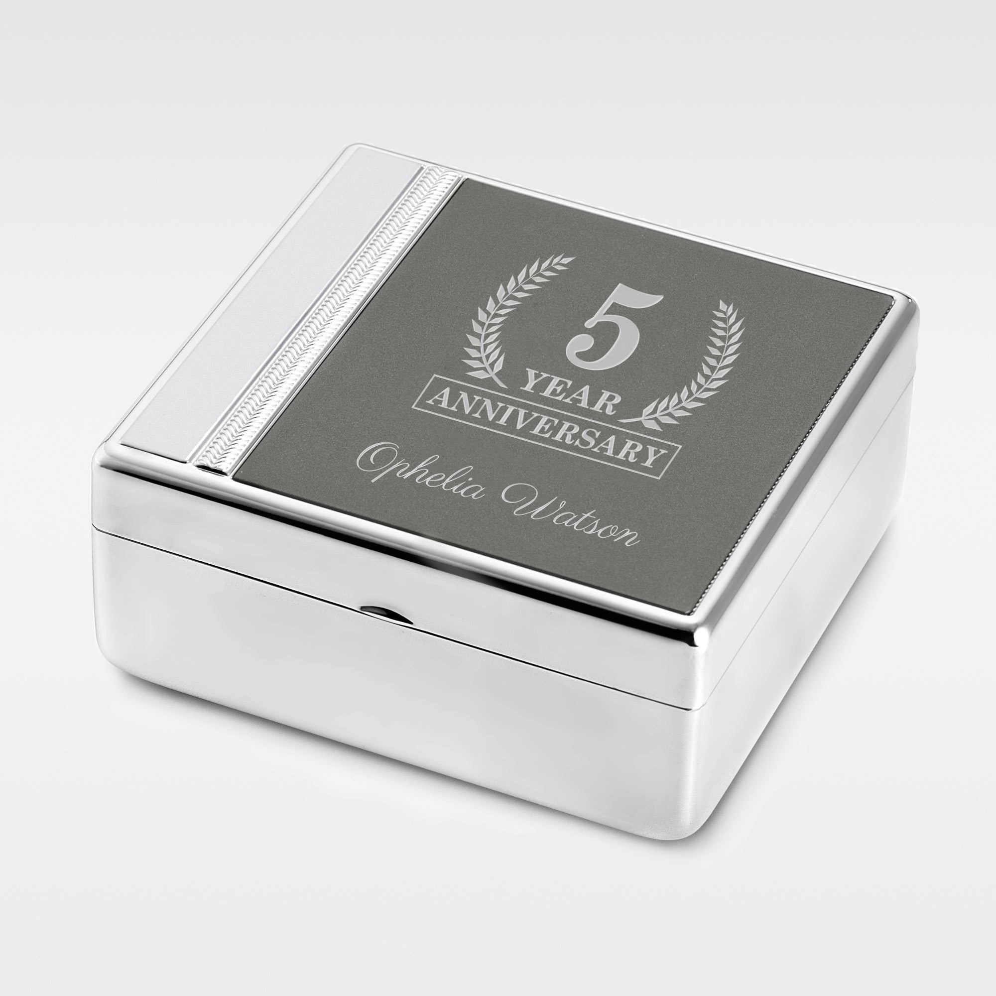 - Square silver-toned keepsake box with hinged lid and gunmetal insert for engraving a personal message