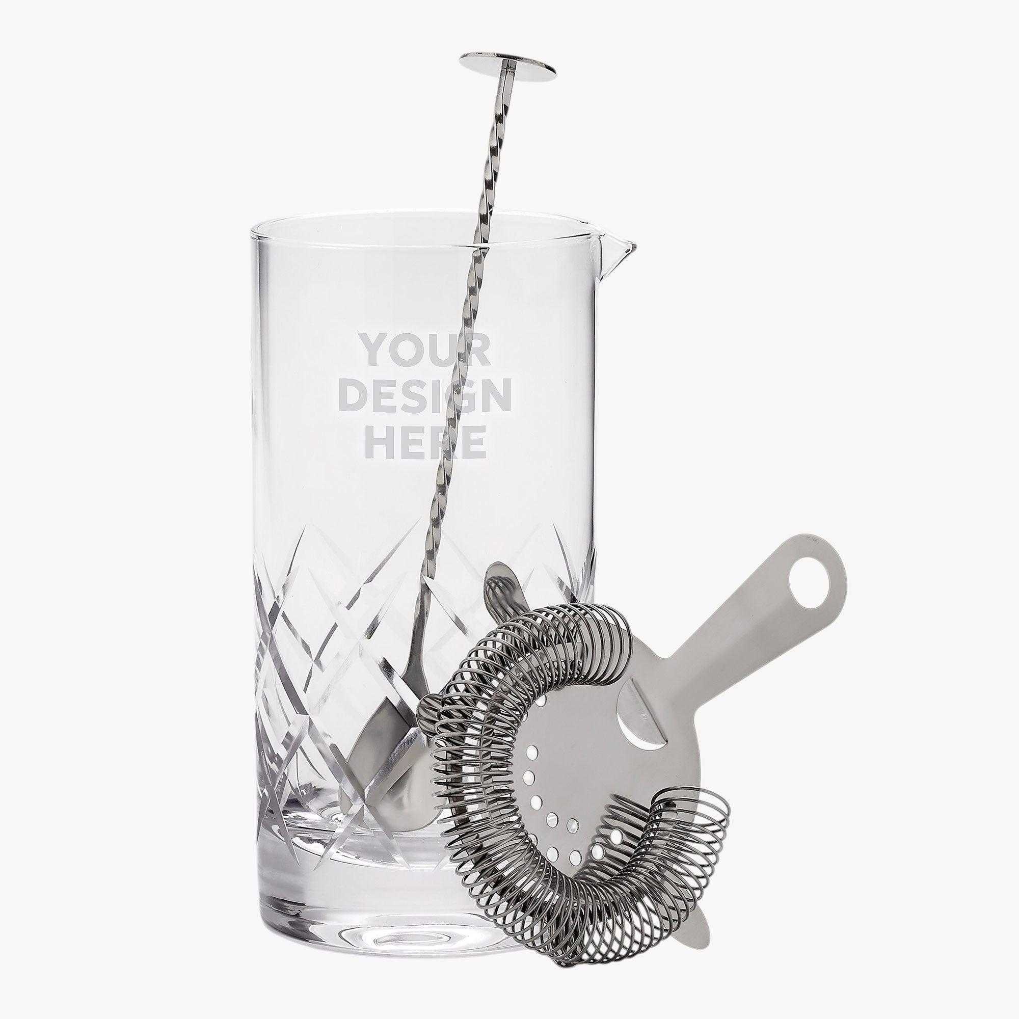 Customize the Corporate Mixing Glass set with any name, logo, and/or text. This item is perfect for entertaining clients, or can be kept at any bar or restaurant. Set includes glass, stiring spoon, and strainer.