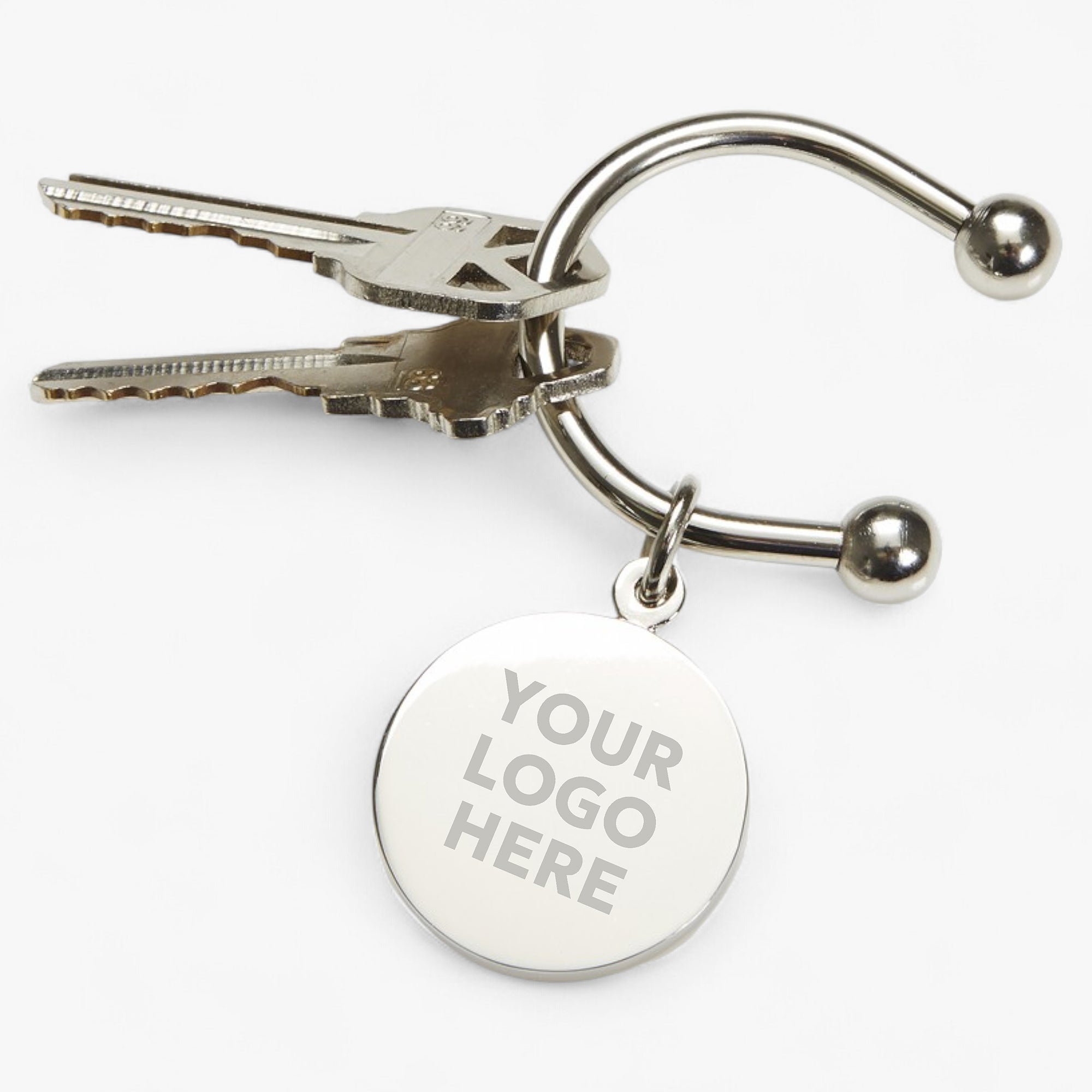 The silver ball at the tip screws off to easily add or remove keys, making this custom logo keychain a convenient corporate gift for clients, customers, employees, and executives.
