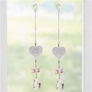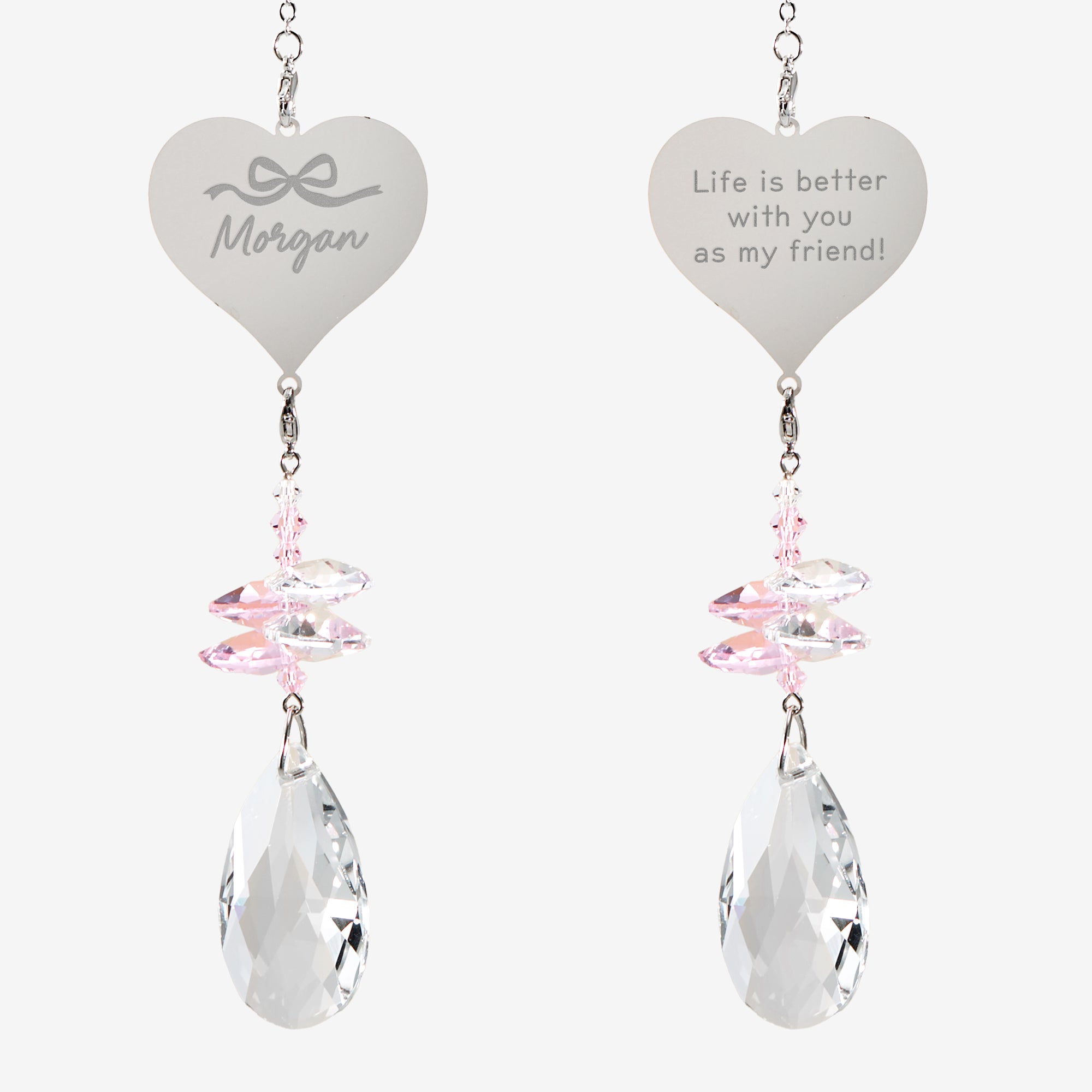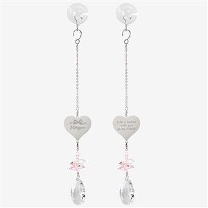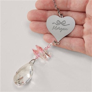 Add a personal touch to your gift-giving with this elegant Darling Bow Personalized Heart Suncatcher, featuring a delicate bow accent and a custom name engraving. Adorned with shimmering pink crystals, this sun catcher sparkles beautifully in the sunlight, casting warm reflections that brighten any space. Makes the perfect for celebrating someone special.