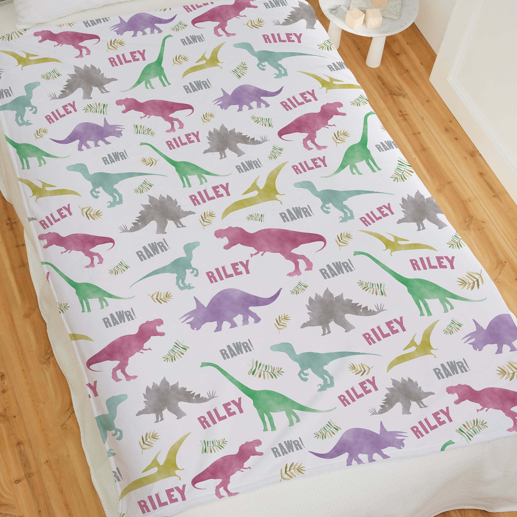 Guarantee sweet dreams when they cuddle up in our Dinosaur World Personalized Blanket. The trendy and colorful dinosaur pattern features their name repeated throughout the blanket in a fun way.
