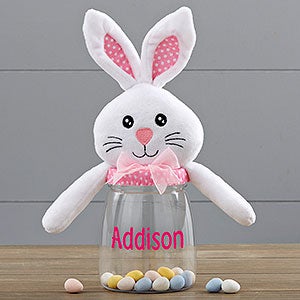 Our Easter Bunny Personalized Candy Jar makes an adorable little Easter gift for any little one. The adorable plush, velboa bunny is accented by a stylish polka dot pattern and intricately stitched details.
