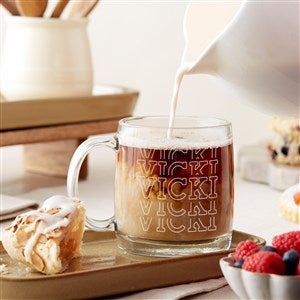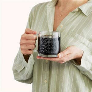 Make every coffee break uniquely yours with the Echo Name Engraved 12.5oz Glass Wide Mug. This sleek and modern glass mug features a wide silhouette and a comfortable handle, perfect for enjoying your favorite hot or cold beverages. The standout feature? Your chosen name engraved in a stylish repeated pattern on the mug, creating a bold and personalized statement.