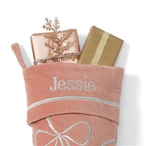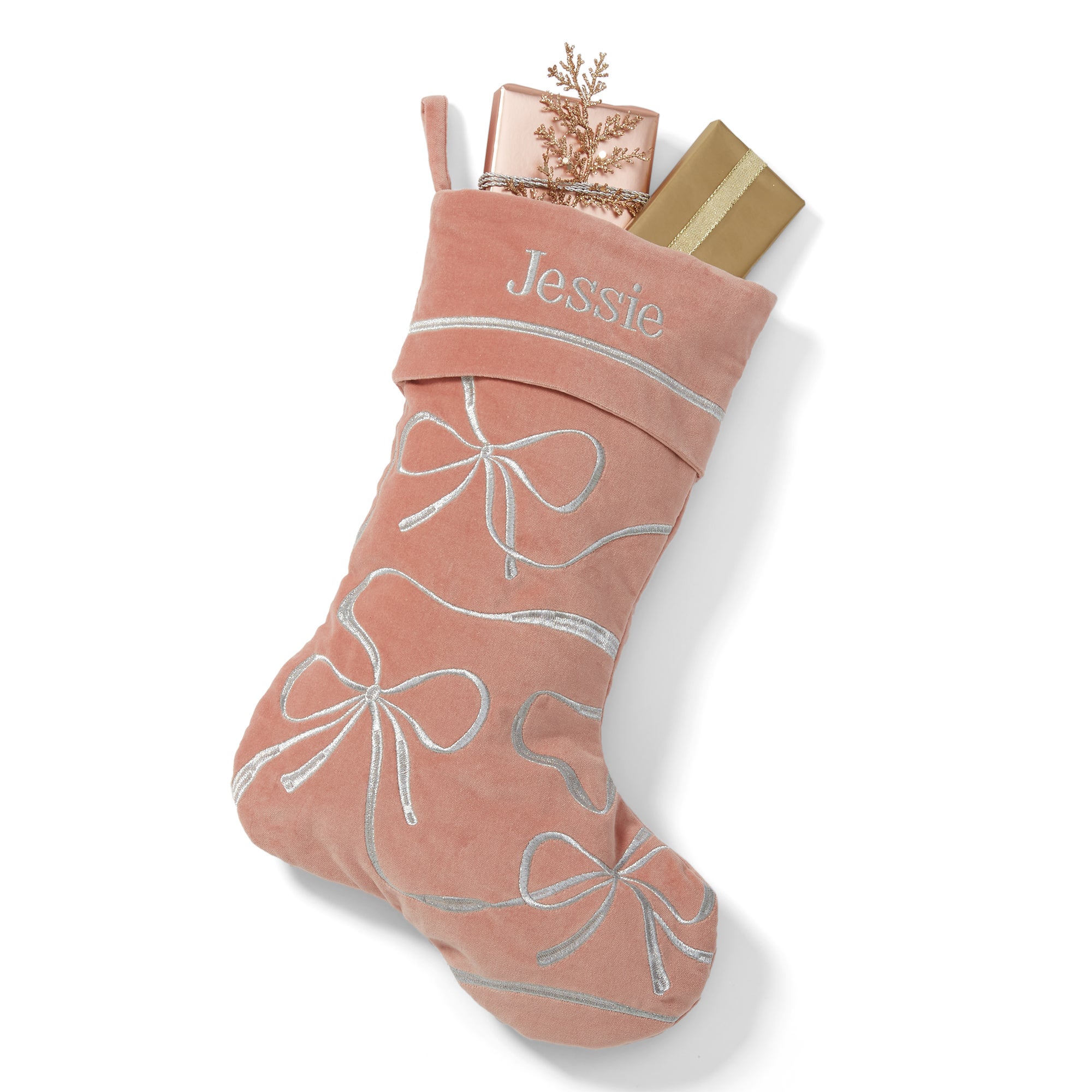 - Soft pink stocking with silver ribbon and bow embroidered detailing