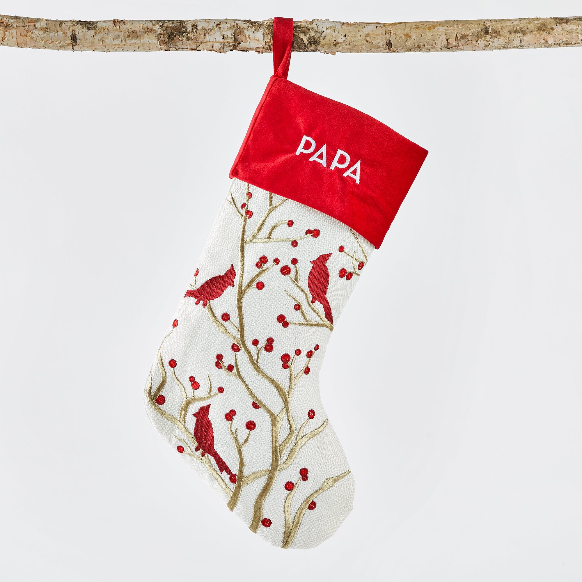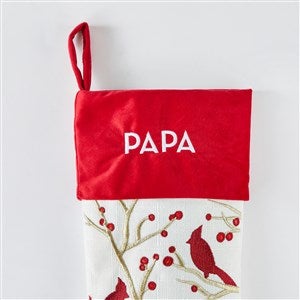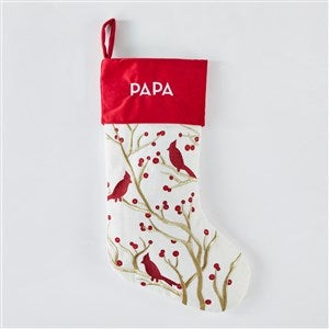 Our Embroidered Cardinal Stocking is perfect for bird lovers and to remember those no longer with us. The cream woven stocking is embroidered with red cardinals on gold branches featuring a red velveteen cuff.
