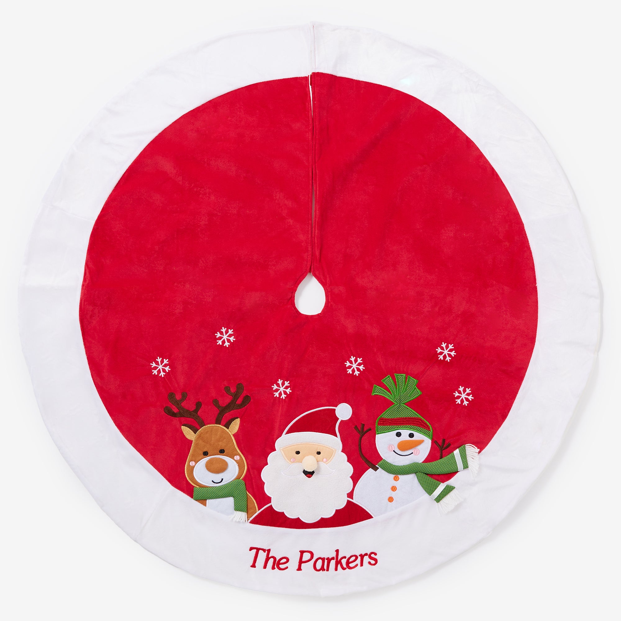 - Santa and his friends are set against a rich, red background and white trim accented with white embroidered snowflakes