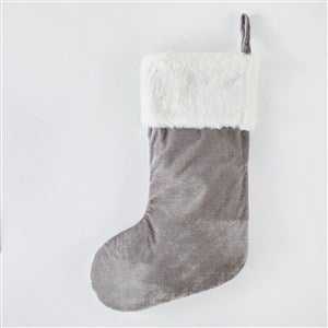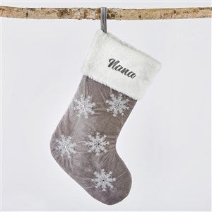 - Grey velvet stocking with embroidered silver snowflakes and faux fur cuff