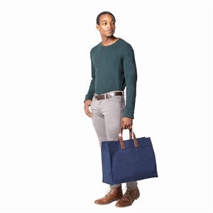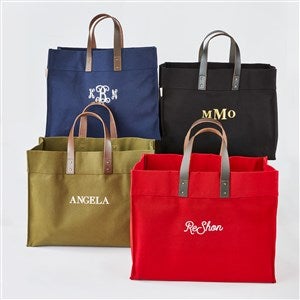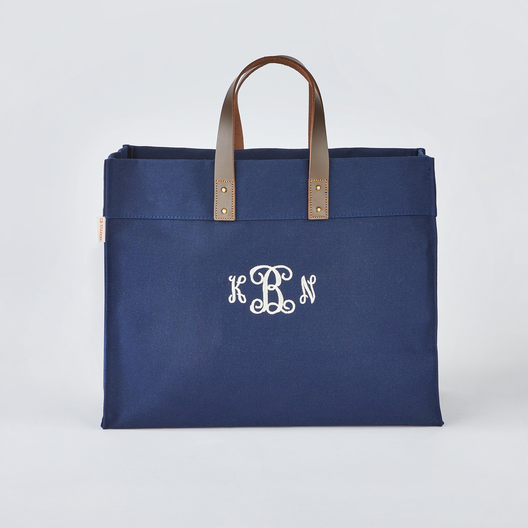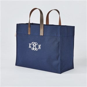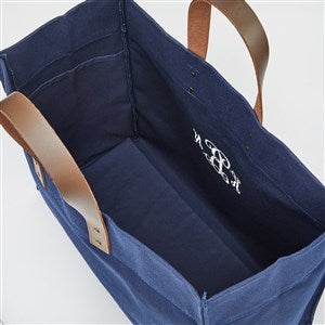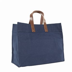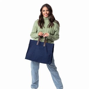 - Canvas medium-sized tote in navy with brown leather handles for durable use and wear