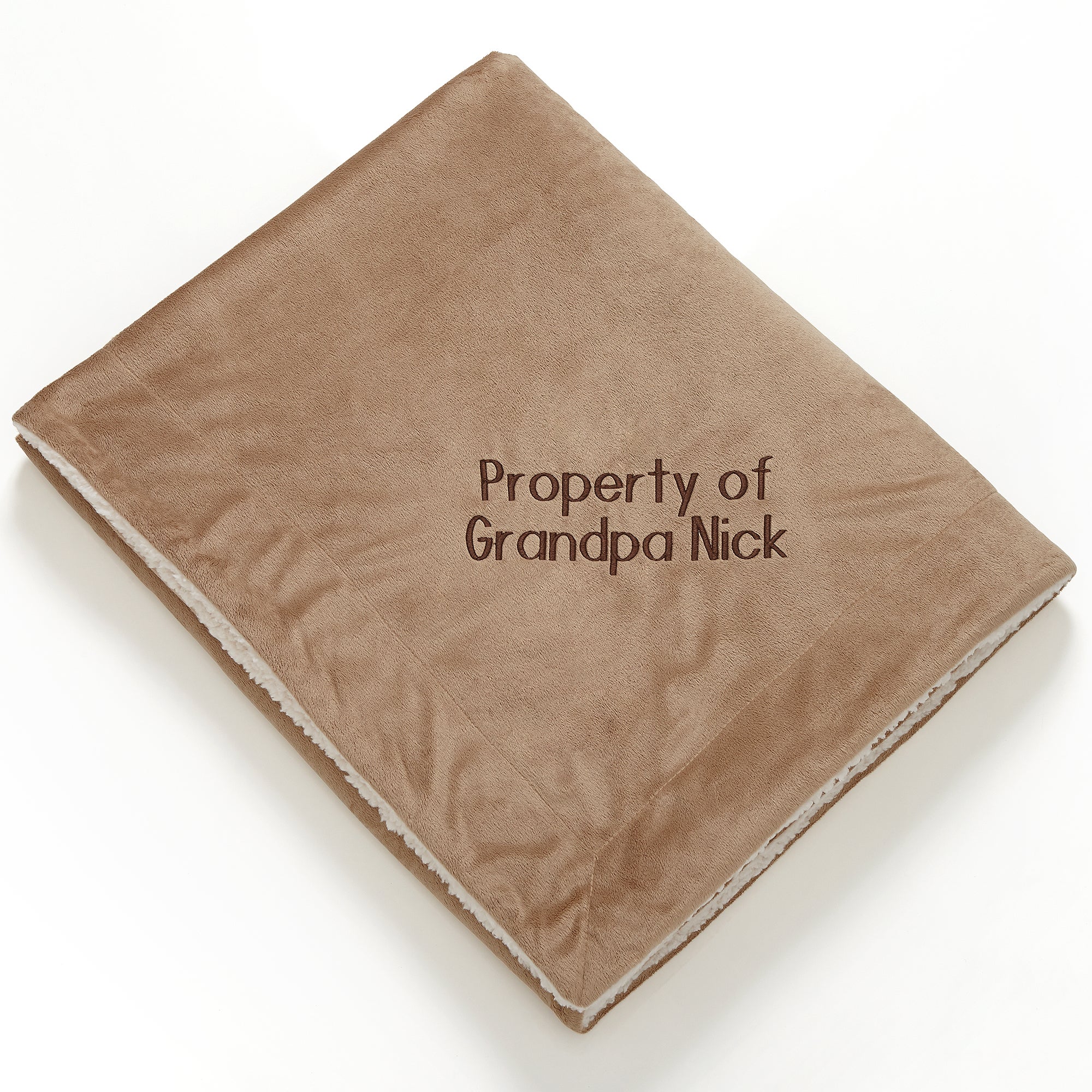 Our Embroidered Sherpa Blanket For Him is so soft and snuggly, he will never want to leave home without it! The blanket comes in 2 color options, grey or tan, and 2 size options, 50x60 or 60x72. Personalized in your choice of multiple thread colors, 2 fonts and any 3 lines of text for a truly one-of-a-kind, unique gift.