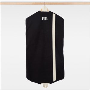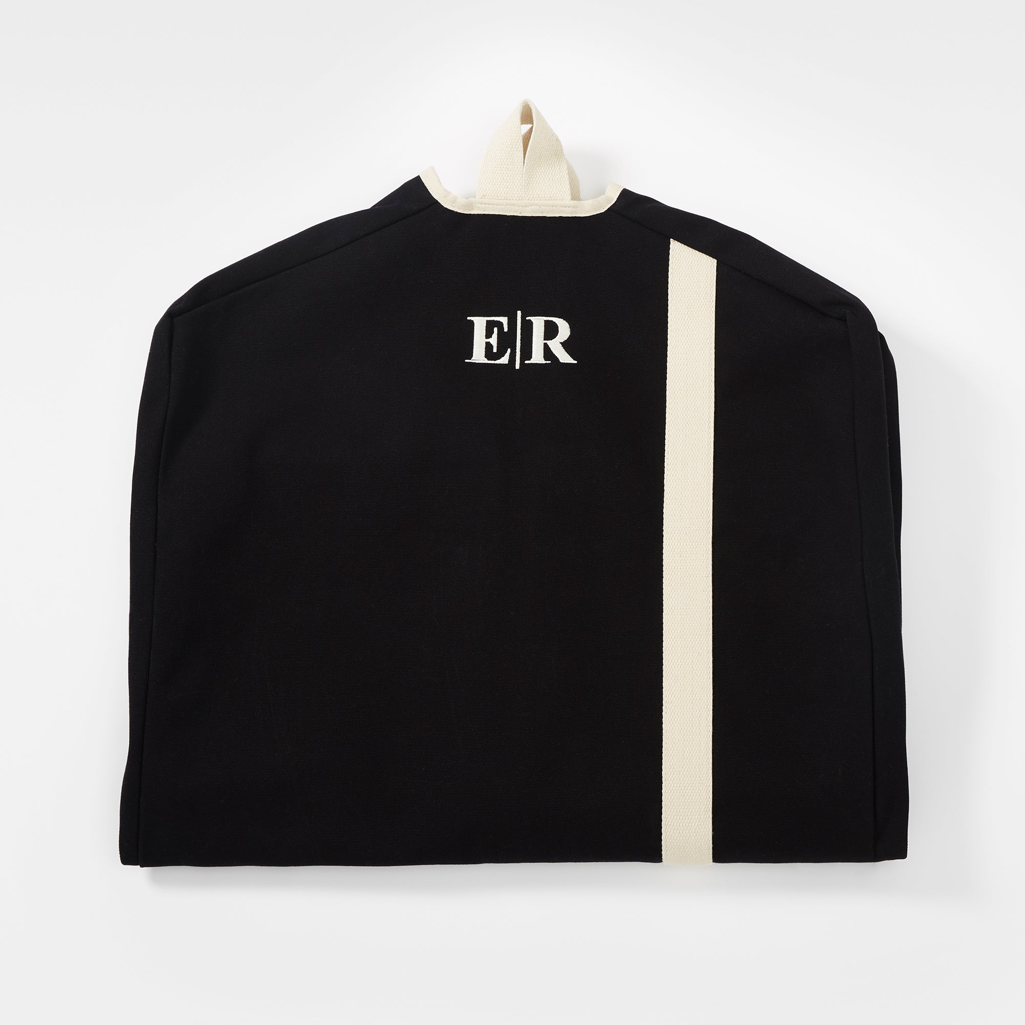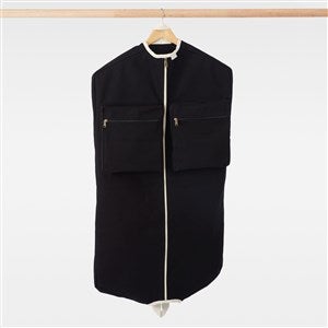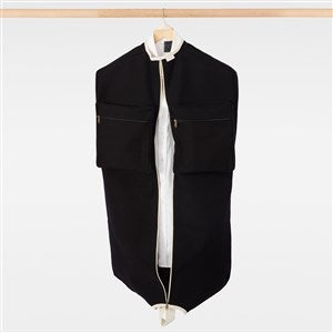 - Black canvas garment bag that can easily be folded with handle to hook over hanger for easy travel